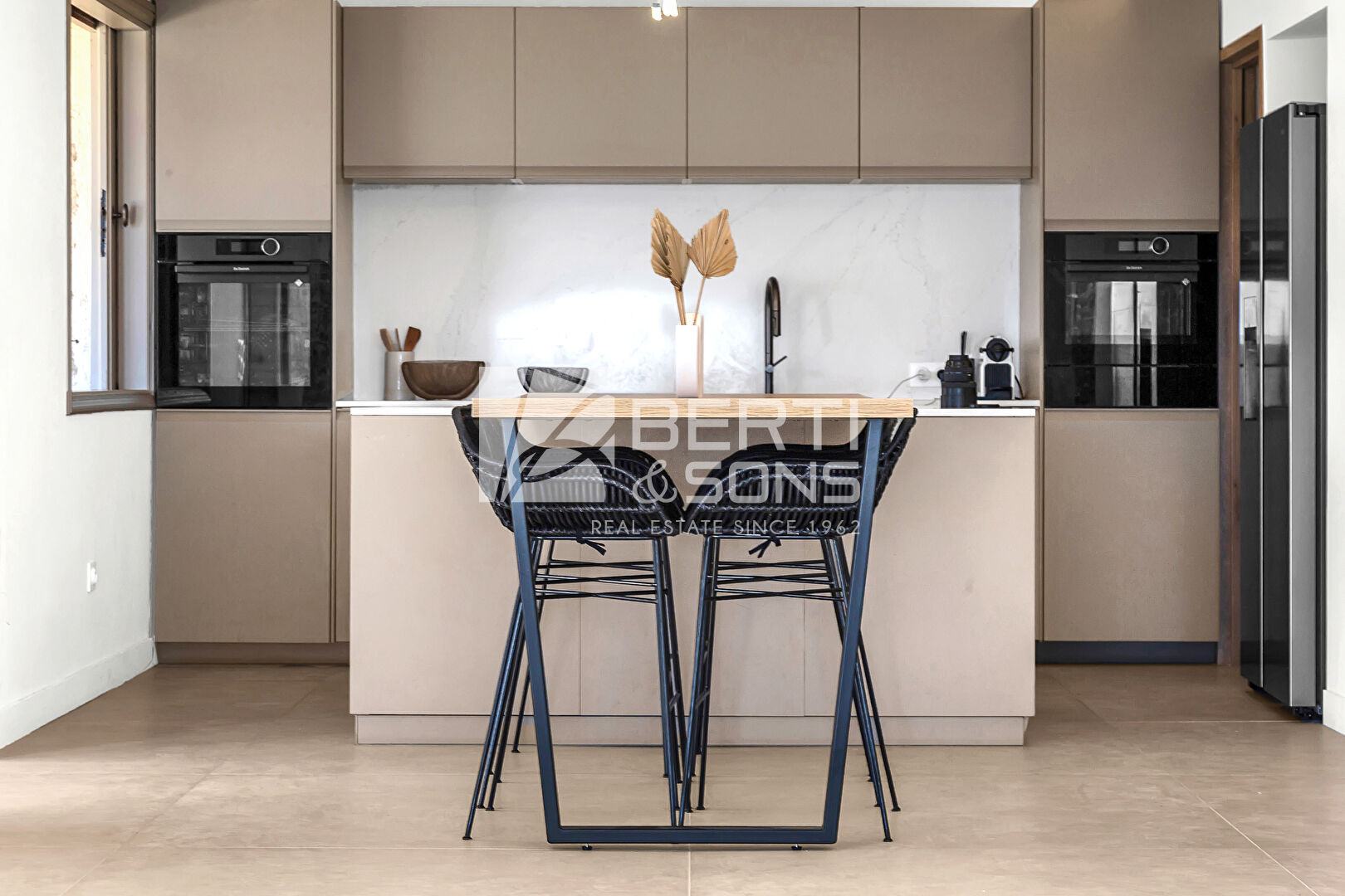La cuisine moderne, entièrement équipée avec de l'électroménager haut de gamme, bénéficie d'un office attenant, idéal pour le rangement et la préparation.