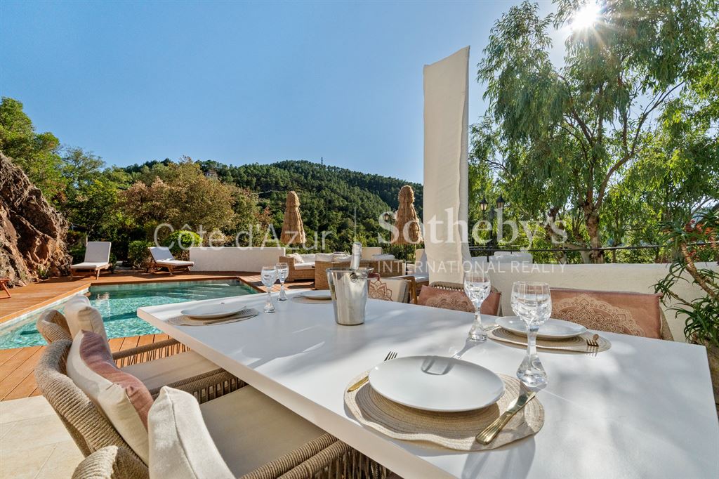 Construite sur la roche de l’Estérel, la propriété d’environ 200 m² se compose d’une belle entrée, d’un vaste séjour lumineux avec cheminée, et d’une cuisine équipée ouvrant sur les terrasses et le jardin.