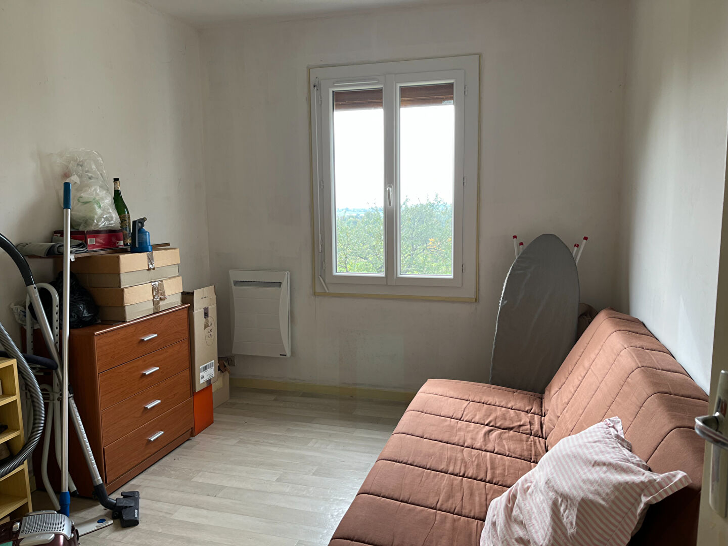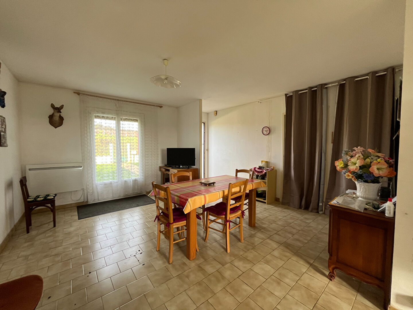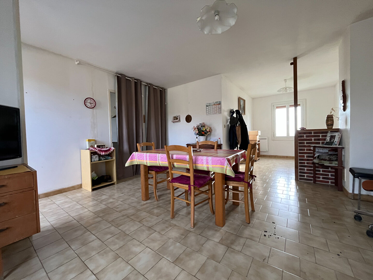 entrée, salon salle à manger avec conduit de cheminée (possibilité d'installer un poêle), cuisine aménagée, un couloir distribue deux chambres, une salle d'eau et un WC.