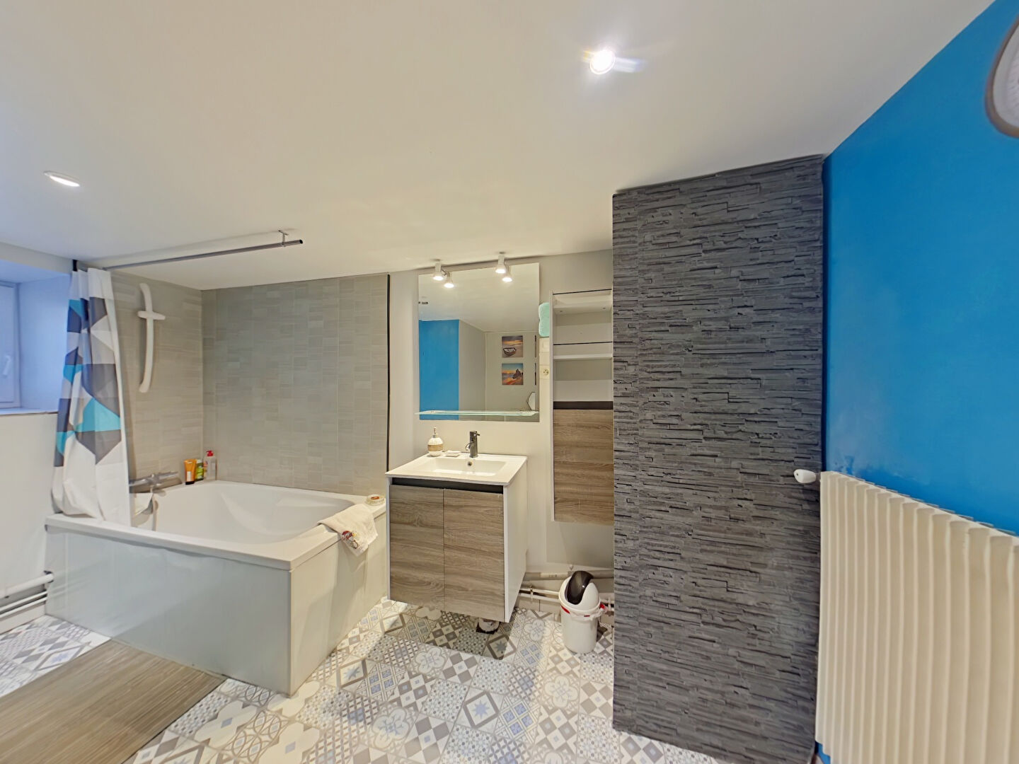 Au 1er, palier, par un escalier en pierre, palier, deux chambres dont une avec salle de bains.