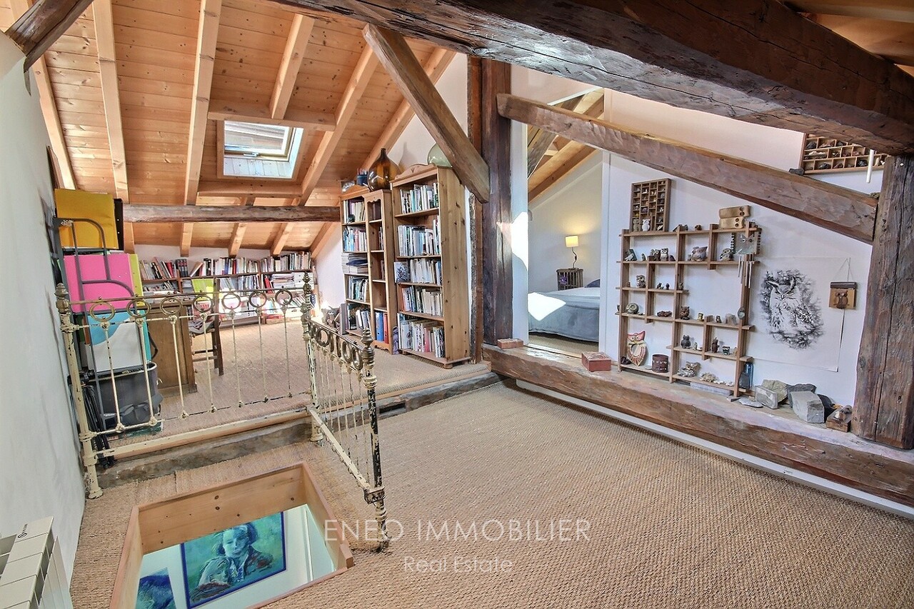 Les combles aménagés offrent un espace atypique et plein de charme, comprenant une grande bibliothèque et une chambre dortoir sous toiture — un véritable cocon pour les enfants ou les invités.