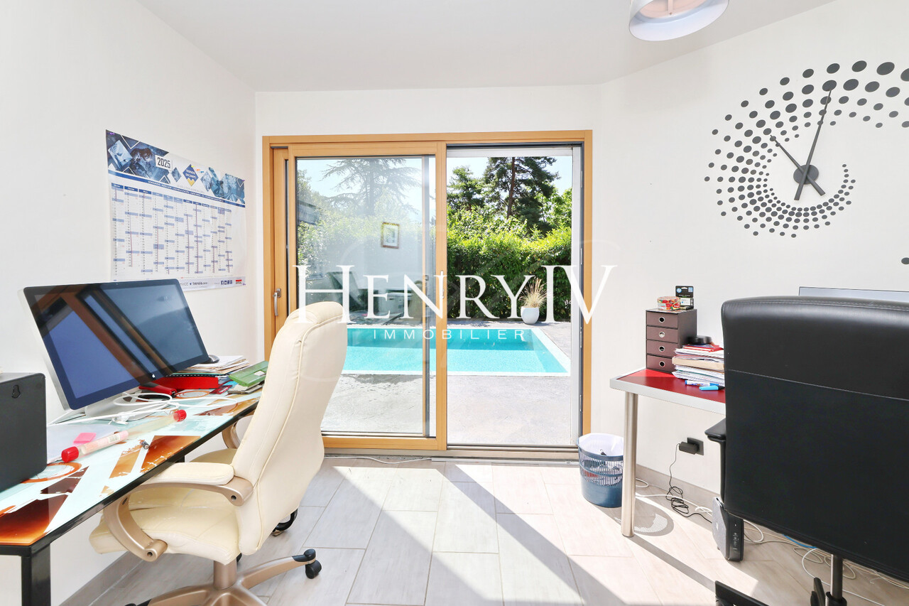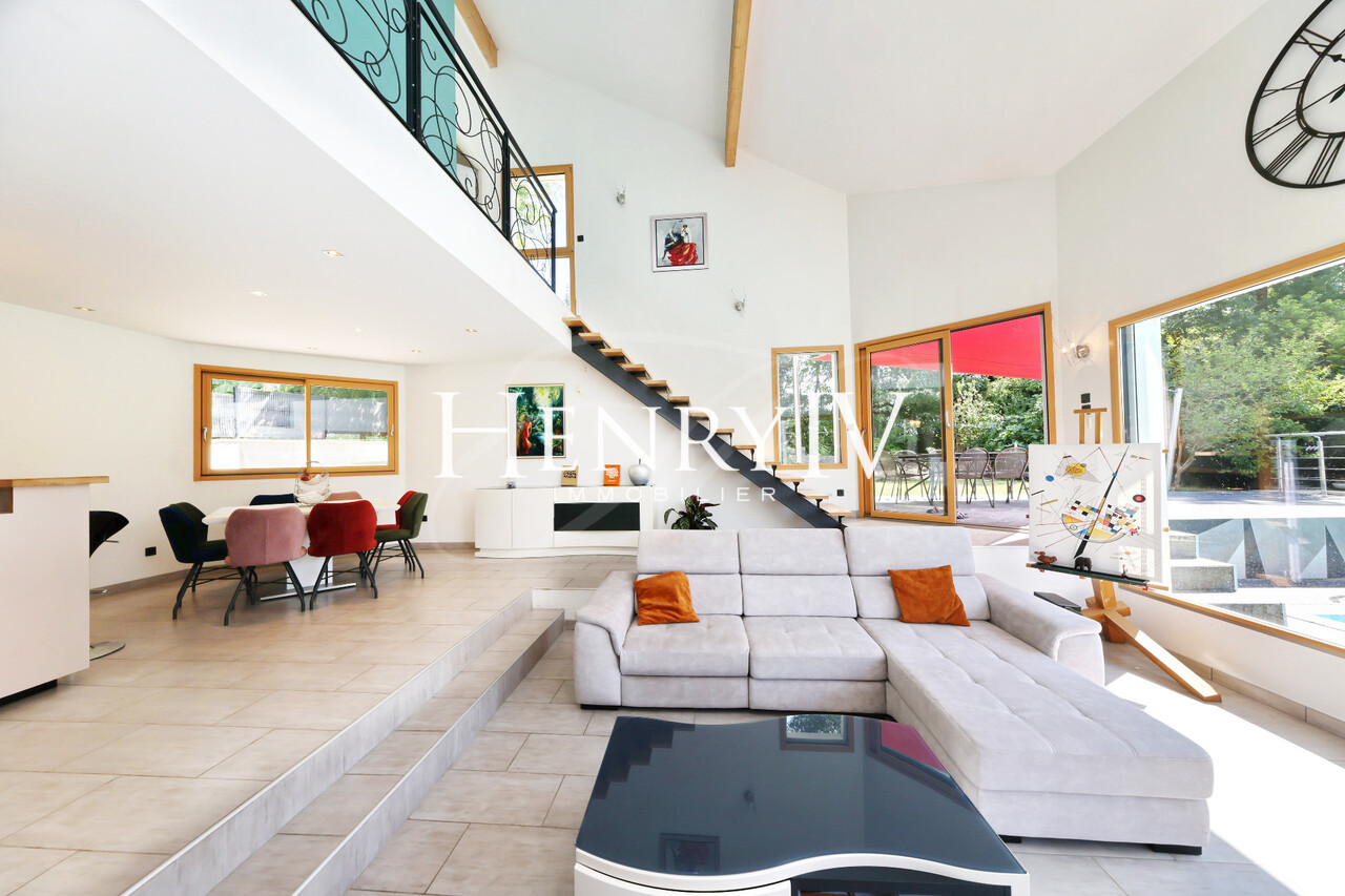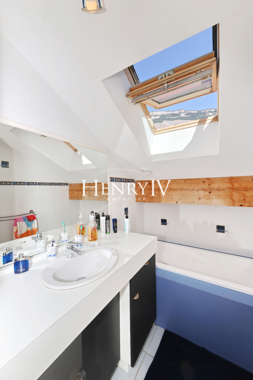 Située au fond d'une impasse, belle villa construite en 2006 par un architecte sur un terrain de 879 m2 composée d'une entrée desservant un grand vestiaire, une salle d'eau, un wc, une chambre, un séjour de 51 m2 agrémenté d'une cuisine ouverte sur le coin repas. A l'étage, 4 chambres dont 1 équipée d'une salle d'eau (+ baignoire), une salle de bains, un wc et une mezzanine qui surplombe le séjour déplafonné. Le jardin exposé sud-Est profite d'une jolie vue sur la chaîne de Belledonne, la piscine miroir apporte une grande originalité à cette propriété au calme et sans vis à vis.