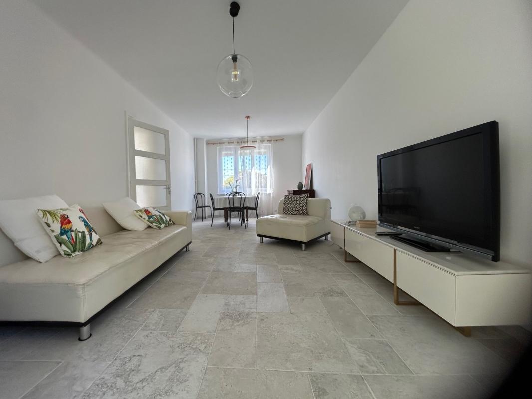 sur le niveau principal, un double séjour de 46 m²avec véranda offrant accès direct au jardin, une cuisine et une salle d'eau WC.