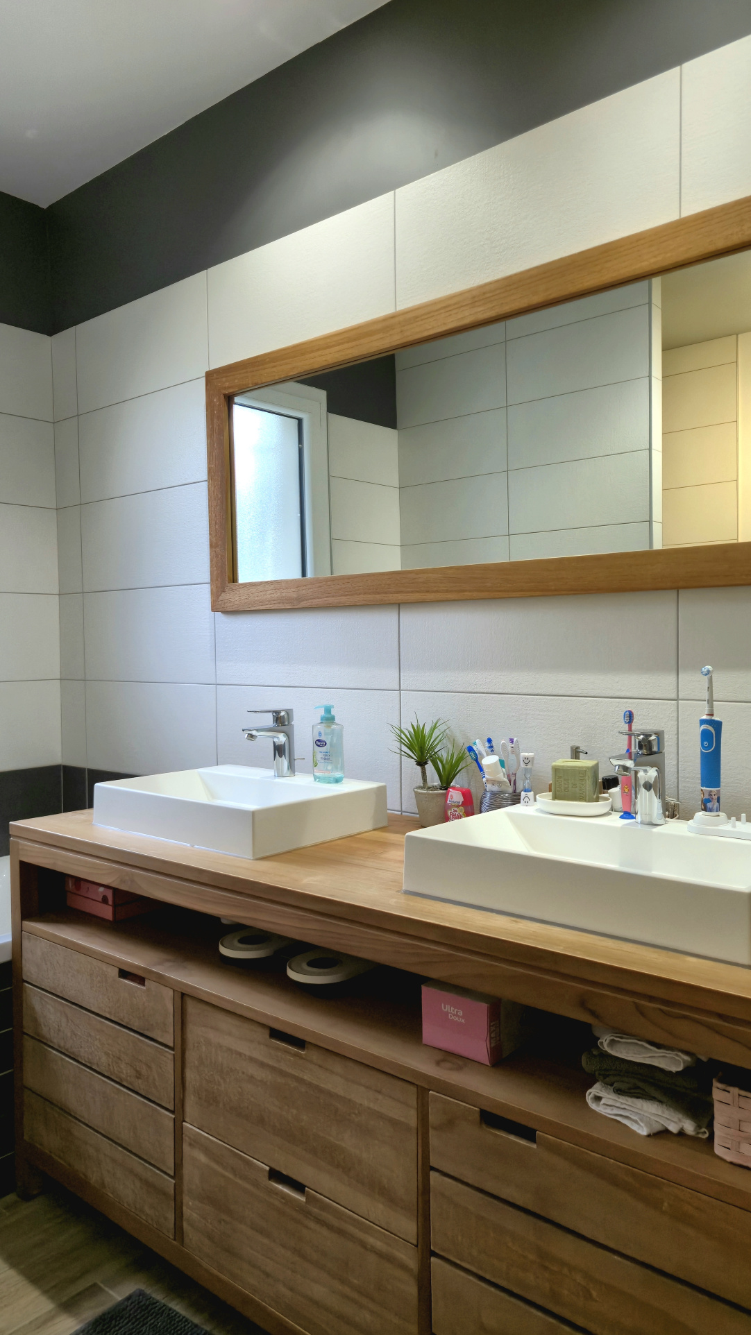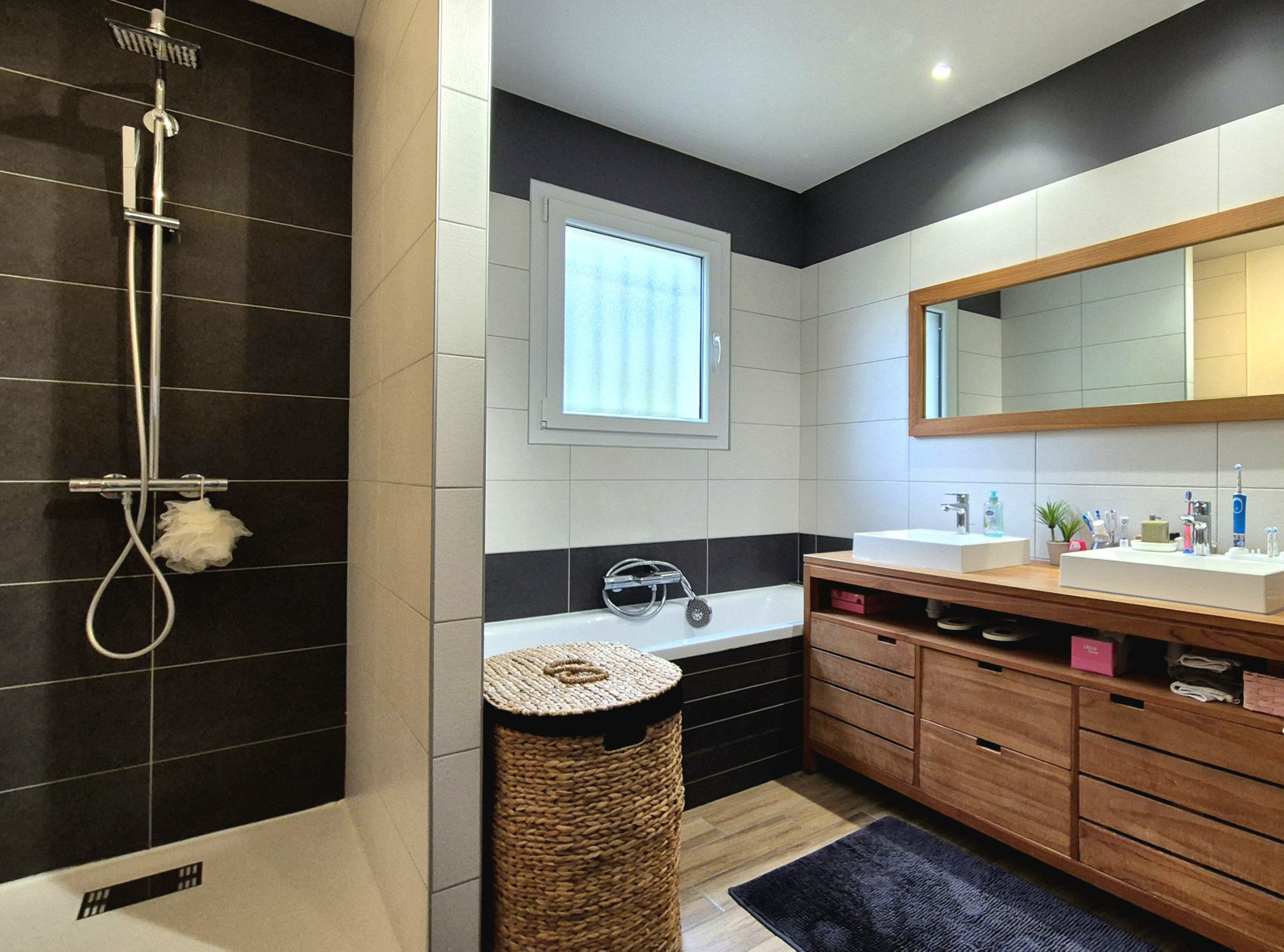 Côté nuit, trois chambres équilibrées avec placards intégrés. Une salle de bains lumineuse avec baignoire, douche et double vasque bois prolonge l'esprit cocon.