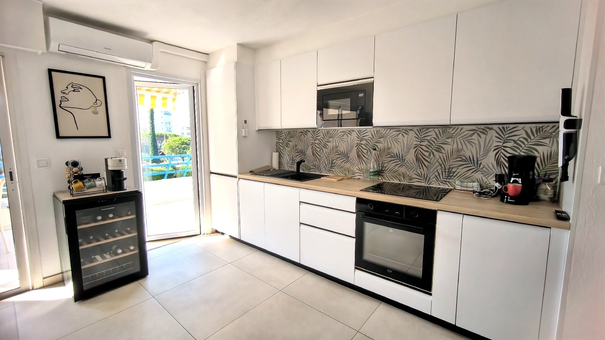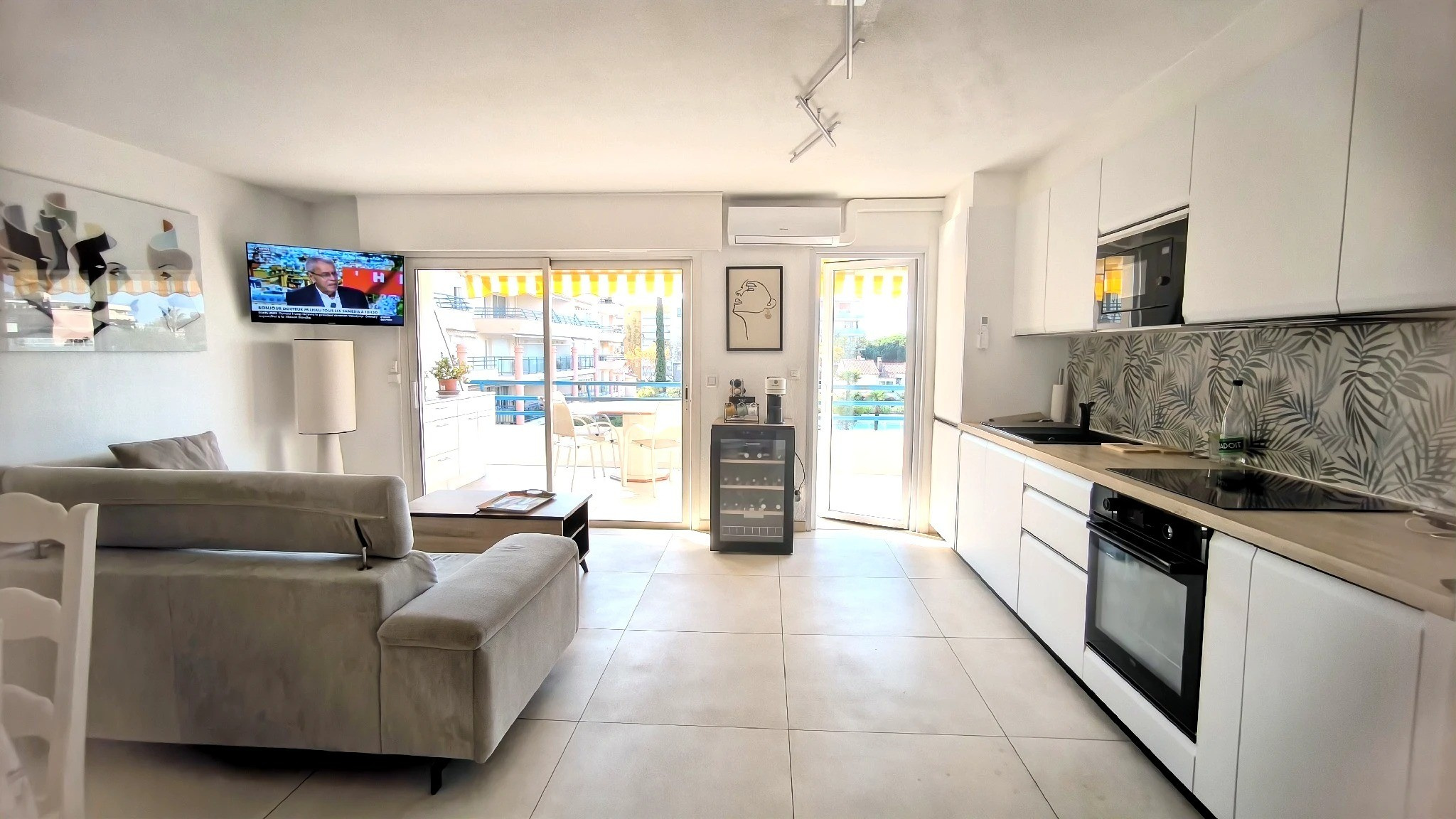 FREJUS PLAGE Proche mer et commerces , dans résidence de standing sécurisée avec piscine, appartement rénover aux prestations de qualité, en étage avec ascenseur, il se compose d'une entrée avec placard, cuisine ouverte sur séjour donnant sur une belle terrasse de 18 m2 exposée sud, une chambre parentale avec salle d'eau à l'italienne, wc séparé, garage en sous-sol