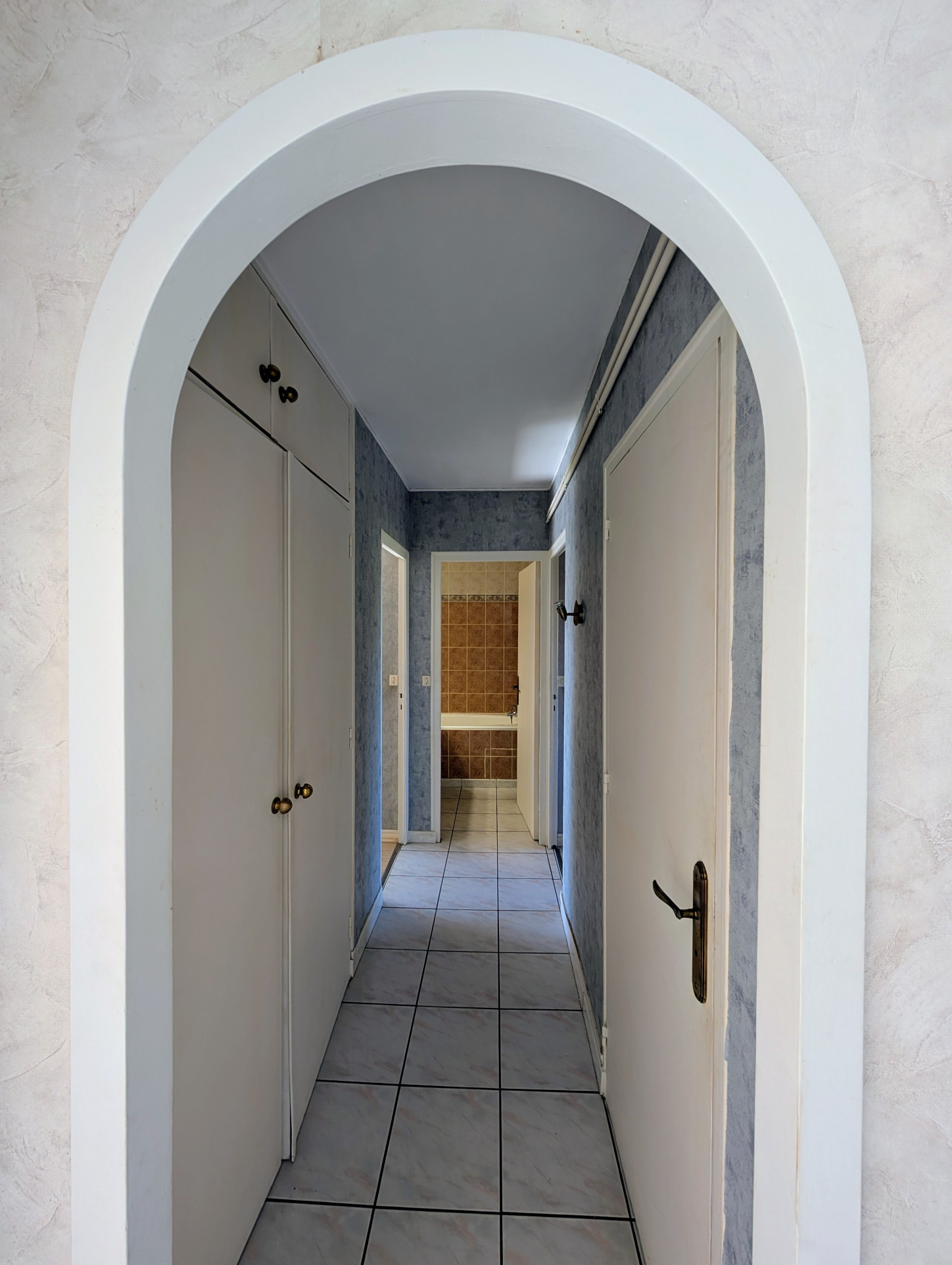 Une entrée distribue un grand salon/séjour avec placard, un toilette ainsi qu'une cuisine séparée et son cellier. Un couloir avec placards permet de séparer l'espace nuit composé de deux chambres et d'une salle de bain.