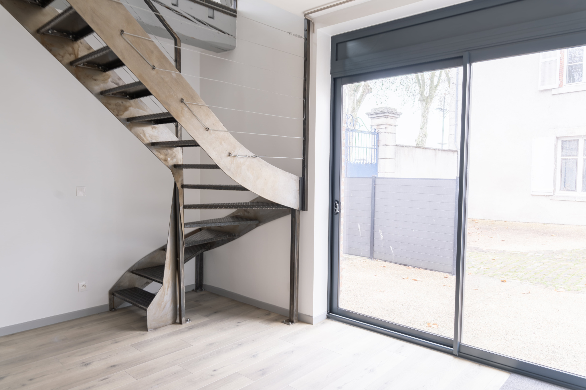 1er : accès par un escalier métallique au joli design , desservant le joli salon, plein de charme avec une vue rare sur la Loire , 1 chambre avec placard avec salle de bains + wc