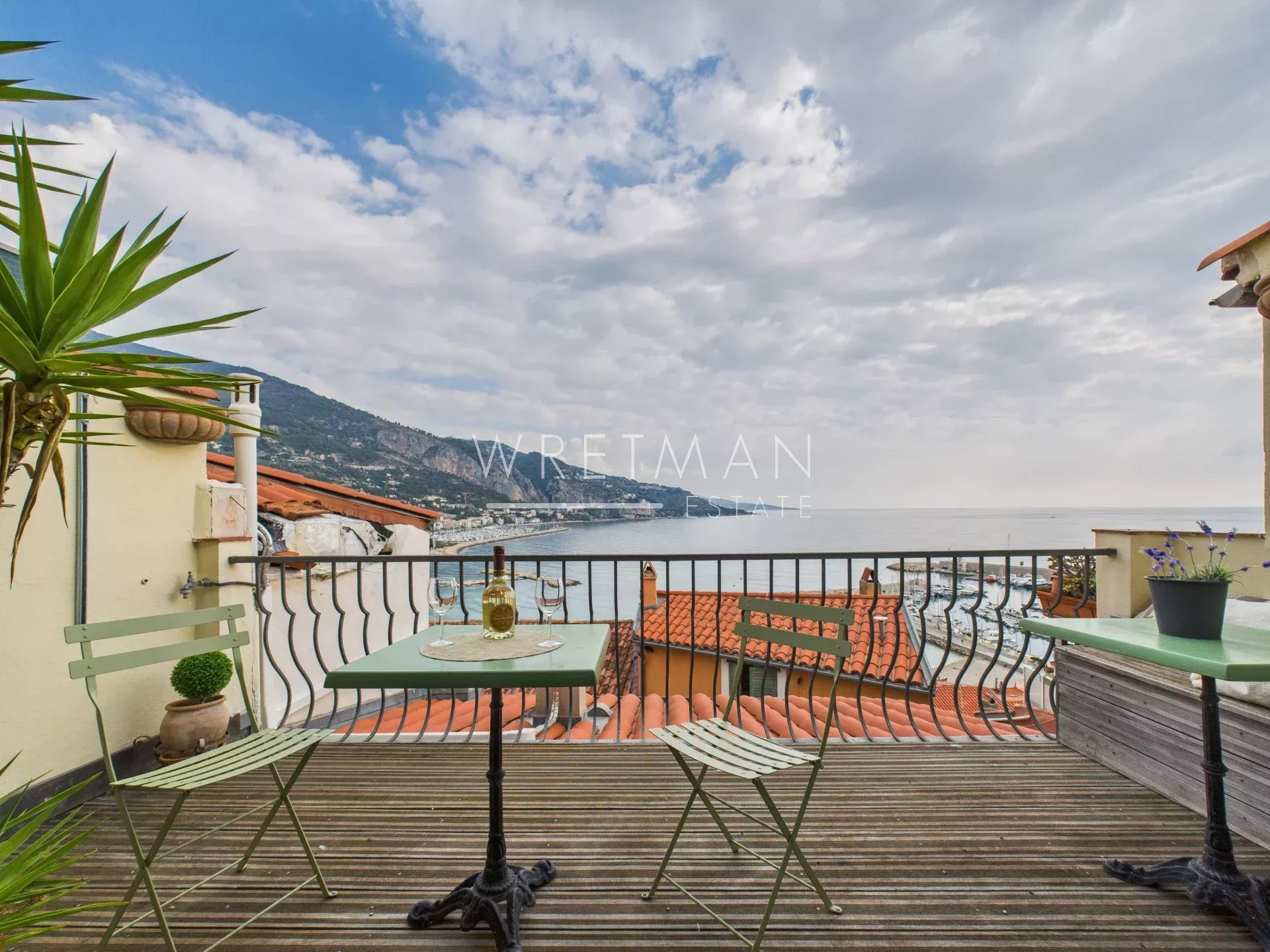 A l'étage, se trouve un appartement en duplex comprenant au 1er niveau : une grande cuisine équipée, une chambre et salle d'eau avec toilettes. Au niveau supérieur, une belle pièce de vie ouvrant sur une terrasse de 10 m² avec une vue panoramique sur la mer et la côte italienne.