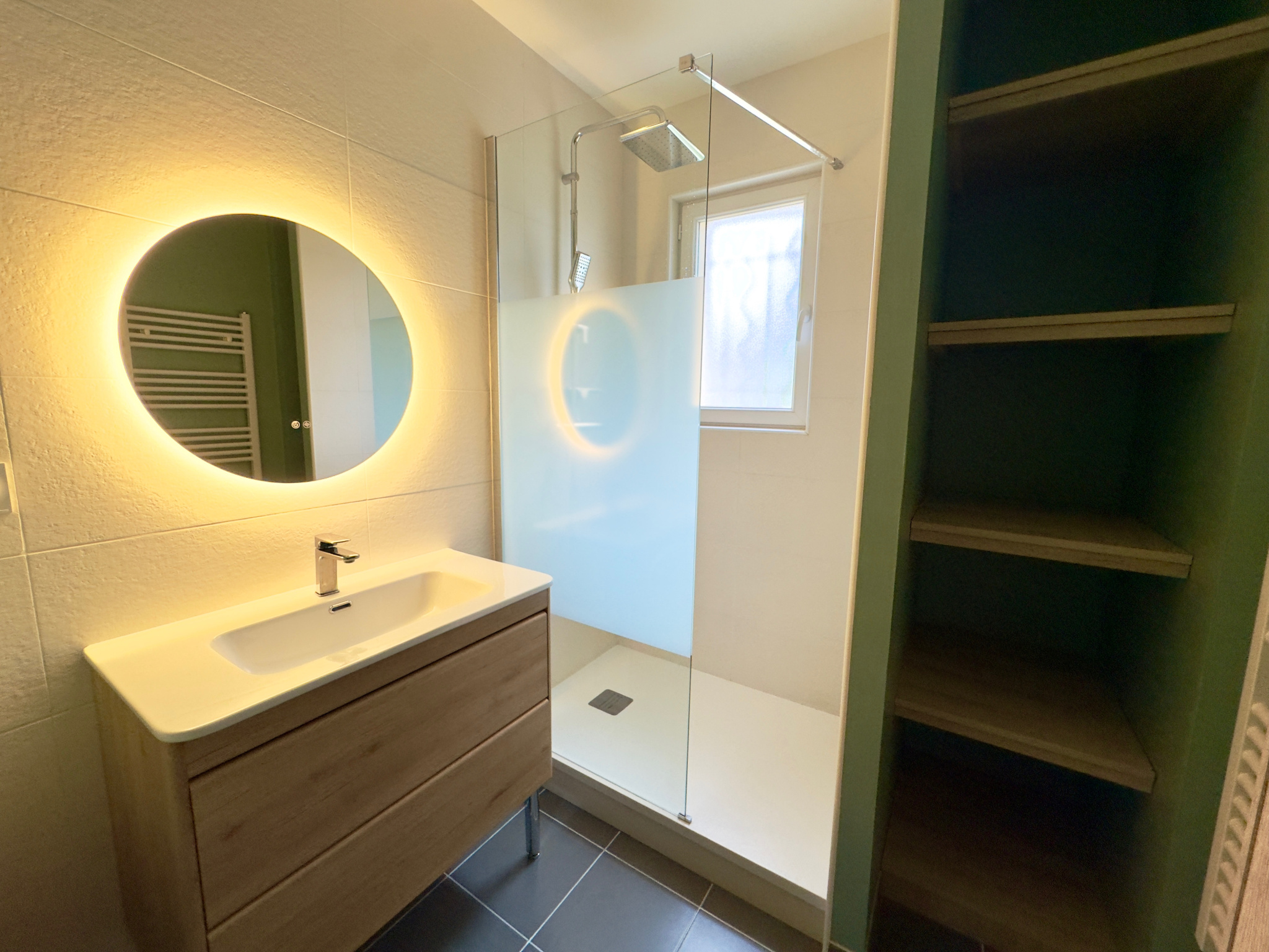 Au rez-de-chaussée, vous découvrirez une belle pièce de vie baignée de lumière, ouverte sur une cuisine moderne, entièrement aménagée et équipée. Une salle d'eau avec WC complète ce niveau.