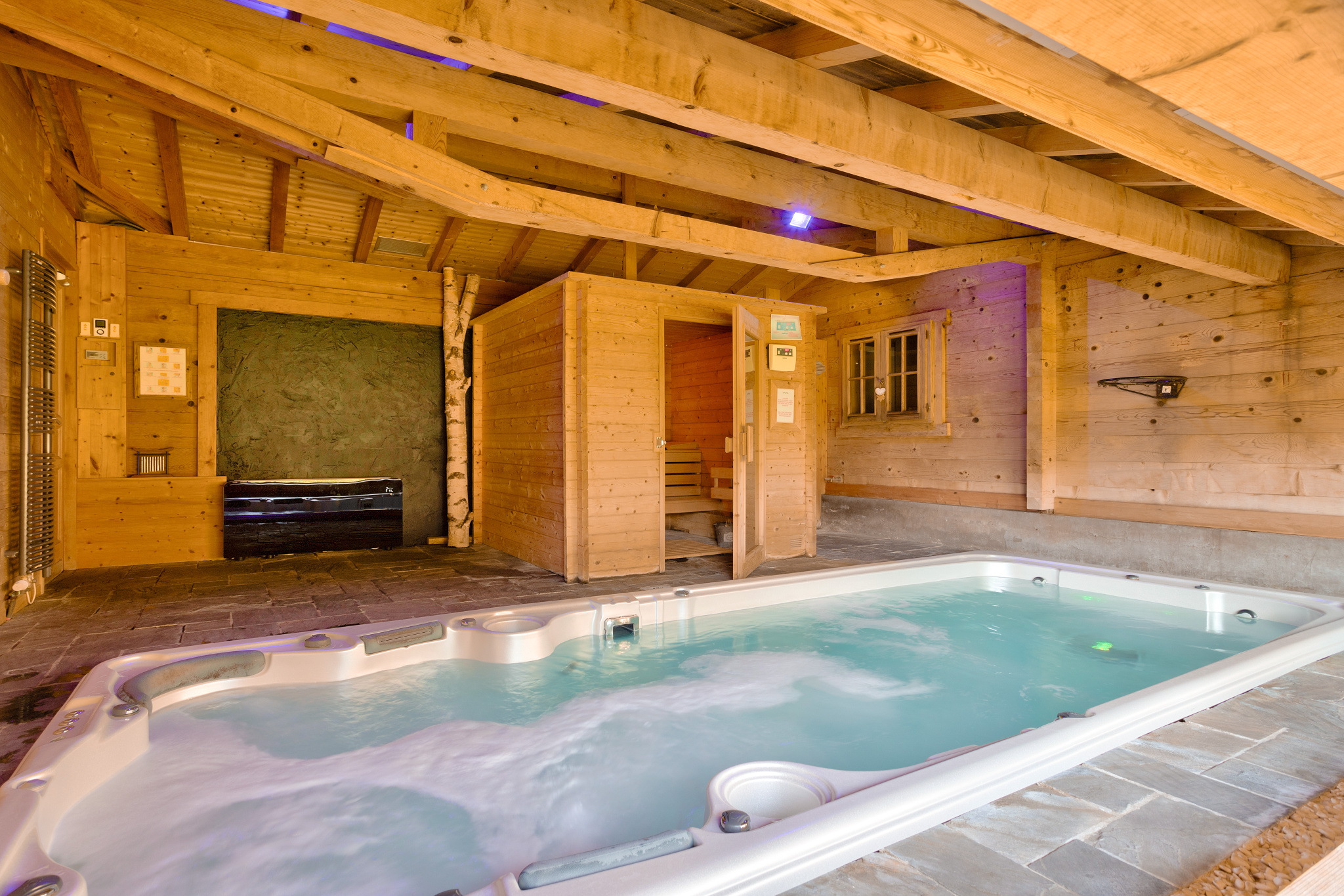 De larges ouvertures, fenêtres et baies vitrées assurent une clarté naturelle remarquable et prolongent l'intérieur vers une terrasse exposée sud-ouest et un balcon, tous deux bénéficiant d'une vue dégagée sur les montagnes. Enfin, ce niveau accueille également un espace spa intégrant une piscine de nage à contre-courant, un jacuzzi et un saunaavec douche attenante.