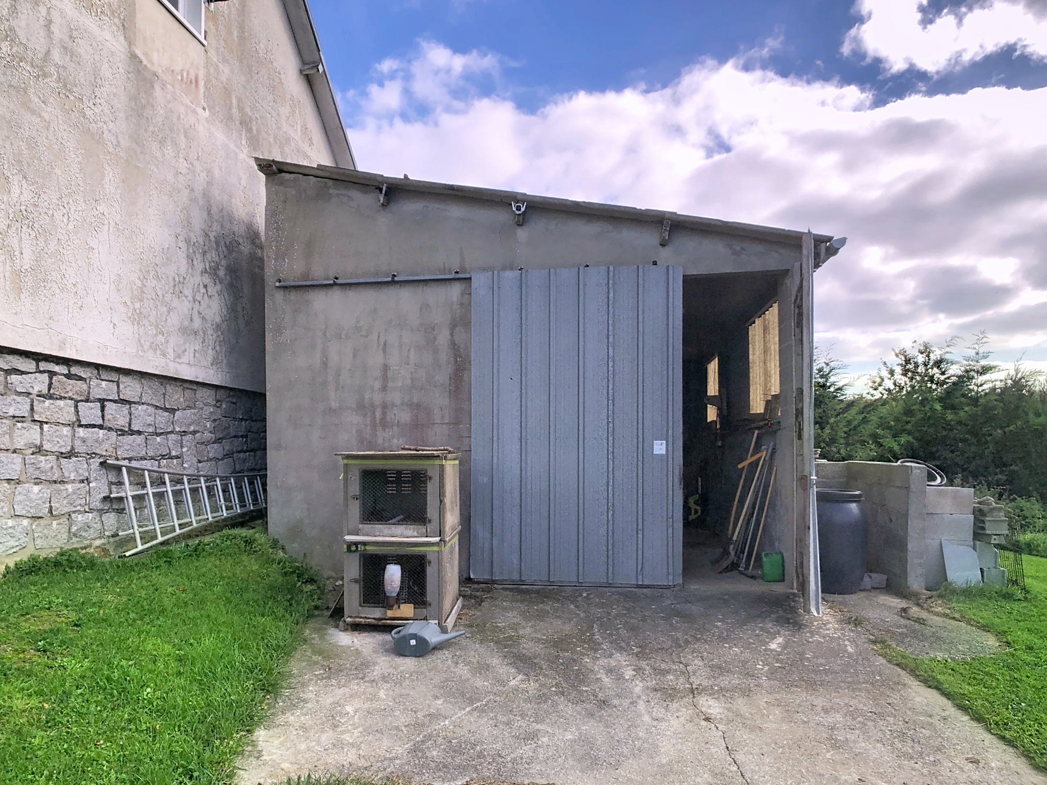 À l'extérieur, le grand hangar constitue un complément rare et précieux, permettant d'abriter un camping-car, de stocker du matériel ou d'envisager un espace pour une activité artisanale ou de loisir.