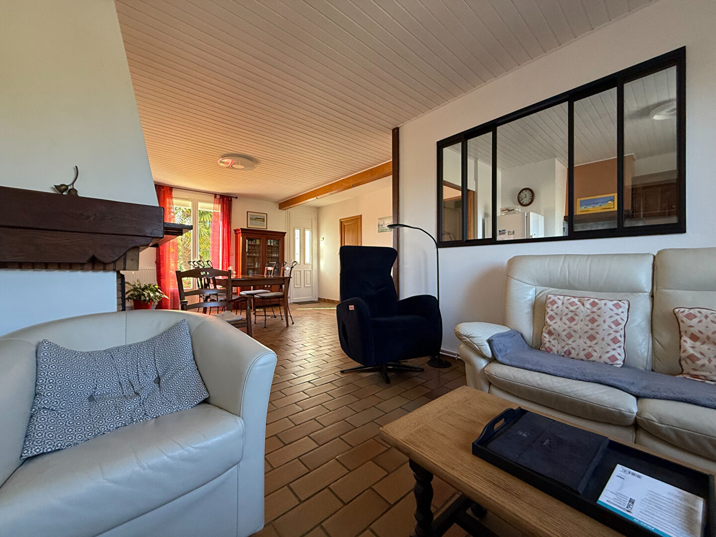 Vous y découvrirez une agréable pièce de vie avec cheminée insert, une cuisine aménagée et équipée ouverte sur la terrasse, permettant de profiter d'une magnifique vue dégagée sur la campagne environnante.