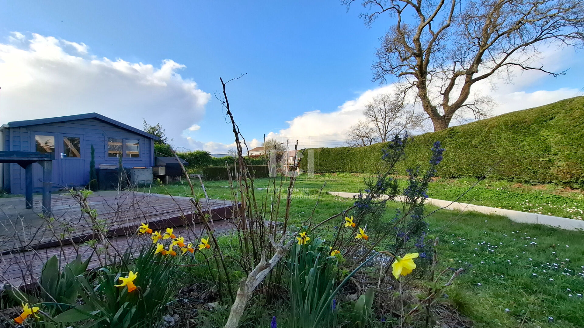 Un grand garage attenant permet de stationner deux voitures, tandis qu'un abri de jardin offre un espace de stockage supplémentaire.
