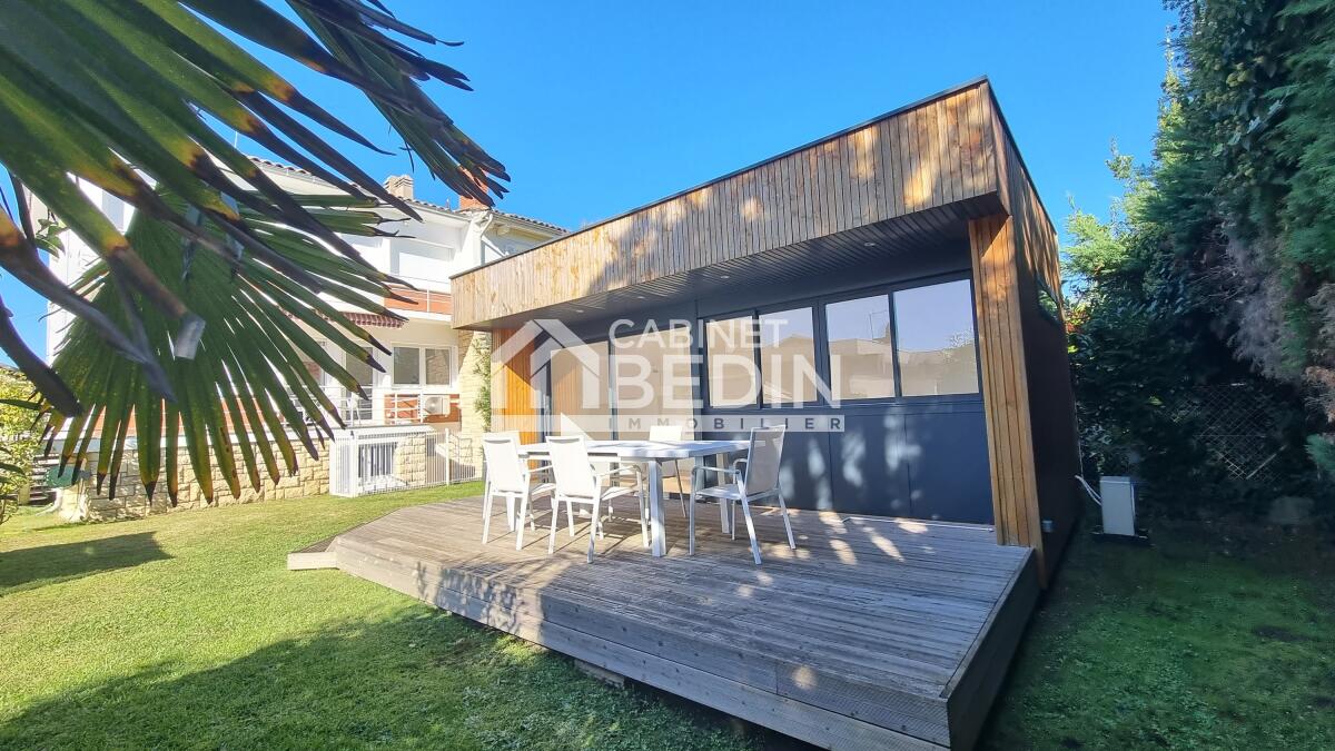 Belle maison familiale avec jardin et dépendance. Belle maison familiale dans une des plus jolies rues du Bouscat. Véritable écrin de lumière, cette maison des années 50, avec signature d'architecte, saura vous séduire par son hall d'entrée majestueux composé de pierre alternée de cabochons au sol, et pavé de verre pour la clarté du volume. L'escalier en pierre et fer forgé dessert les 3 chambres de l'étage avec salle de bain, WC et les 2 autres chambres du R-1 ainsi qu'un espace lingerie et buanderie aménagé de murs de placards, accessible aussi depuis le jardin offrant ainsi une vie de famille très fonctionnelle. L'espace de vie avec conduit de cheminée en attente est largement vitré sur 3 côtés, ouvert sur la terrasse, un escalier permet de profiter du jardin de 200M2 et de la dépendance, bâtiment neuf en bois et baie vitrée acier noir. L'ensemble a beaucoup de charme, architecture des année 50 dans un esprit 'bâteau', garde-corps métalliques, pavés de verre, brique, jeu de lumière et transparence. Proche du parc bordelais, du tram D, des écoles et des commerces. Cette maison de famille très entretenue vous offrira un confort de vie, agrémenté d'une dépendance neuve, le terrain est piscinable. 3 places de stationnement pour les voitures, arrosage intégré, travaux de rénovation récents, alarme, fibre, volets électriques, portail électrique. chauffage au gaz, et climatisation réversible. Toiture refaite et isolée en 2000, isolation par l'extérieur, gouttières et descentes d'eau neuves ainsi que l'ensemble de l'installation électrique. Appelez-nous au 0557225500, pour visiter ce bien rare. Amateurs d'architecture des années 50, ne manquez pas ce rendez-vous !. Les informations sur les risques auxquels ce bien est exposé sont disponibles sur le site Géorisques : www. georisques. gouv. fr. Montant estimé des dépenses annuelles d?énergie pour un usage standard : entre 2140 et 2950 Euros/an (année de référence 2023)