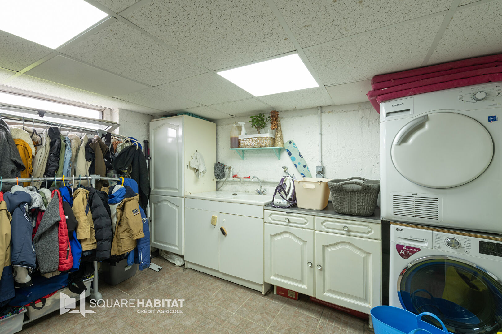 Cette maison mitoyenne d'un côté et surélevée sur sous-sol divisé en espace de stockage et en buanderie, comprenant au RDC : entrée, cuisine aménagée et équipée, séjour avec poêle à bois et WC.