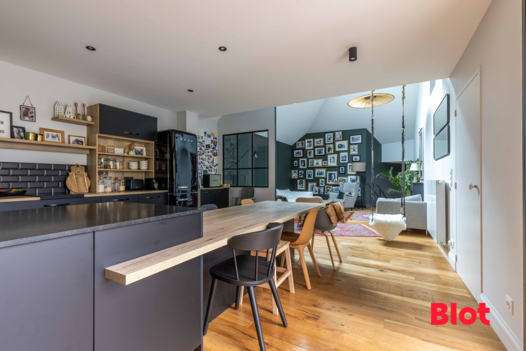 Vous profiterez au rez-de-chaussée d'une spacieuse pièce de vie de plus de 60m². Elle se compose d'un salon avec belle hauteur et d'une moderne cuisine aménagée et équipée avec accès un espace extérieur couvert d'exception !