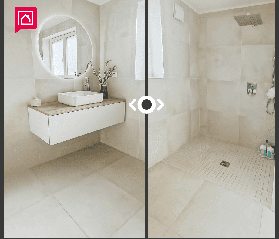 Le rez-de-chaussée propose une chambre de plain-pied avec salle d'eau design, toilettes, douche avec un accès PMR, ainsi qu'une buanderie, une arrière-cuisine et des toilettes invités.