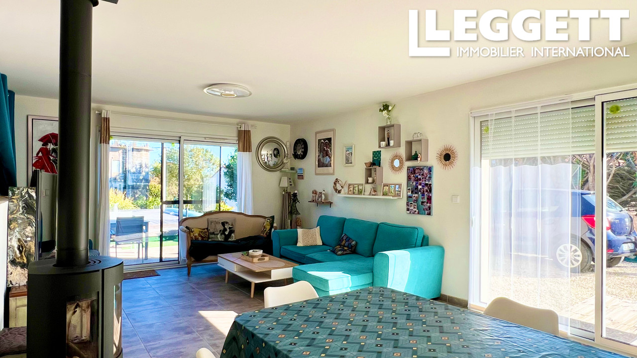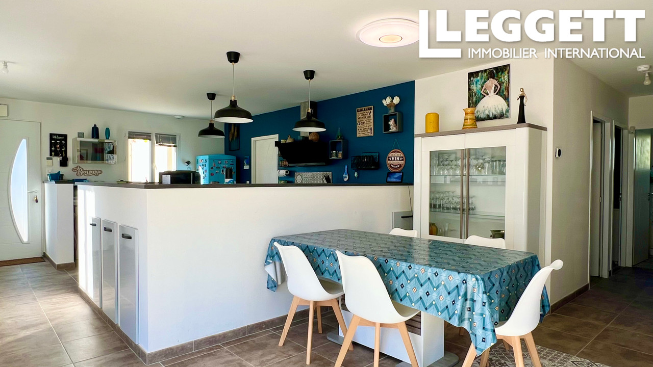 Maison moderne de plain-pied construite en 2019. Le grand espace de vie comprend une cuisine Américaine aménagée/équipée, avec ilot central, table intégrée, un cellier, un espace bureau & espace salon.