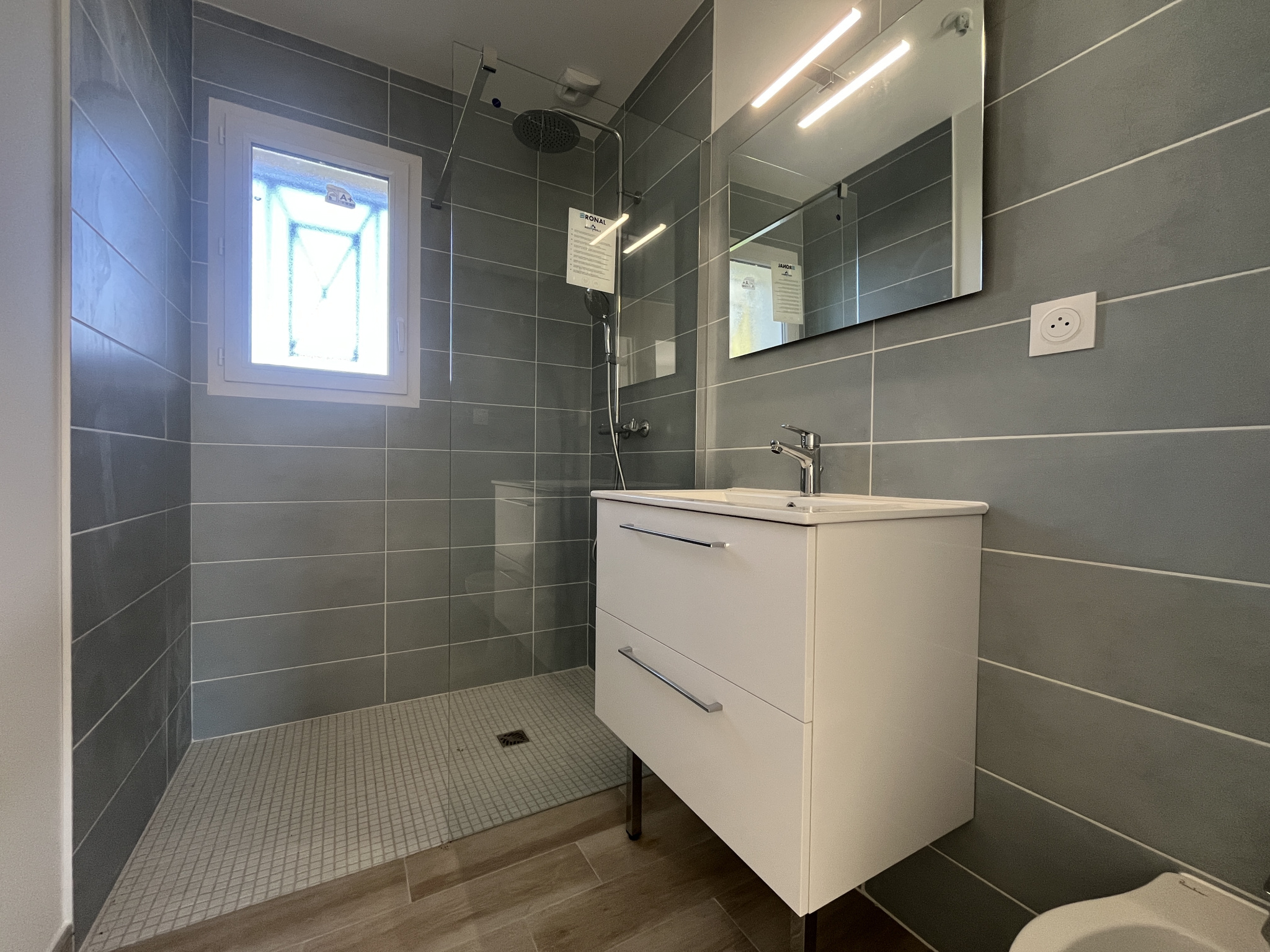 LES MATHES ( 17 ) - Située dans cette commune dynamique, maison individuelle construite en 2024 d'environ 80 m2 habitables de plain-pied. Bien que dans l'agglomération, elle se trouve au calme, implantée sur un terrain d'environ 700 m2 qui reste à délimiter. Séjour lumineux de 32 m2 exposé Sud-Ouest. La cuisine reste à aménager. Le couloir dessert trois belles chambres avec placards ainsi qu'une salle d'eau et des WC séparés. Enfin, un cellier permet d'acceder directement au garage. Elle profite de tout le confort contemporain, chauffage au sol par pompe à chaleur et eau chaude par ballon thermodynamique. Emplacement idéal pour ce pavillon situé à 1 km des commerces, à 5 km des plages de La Palmyre et à proximité des écoles.