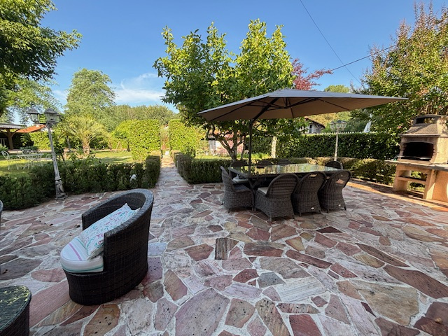 Une seconde terrasse de 100 m2 en pierre du Brésil, idéale pour recevoir famille et amis