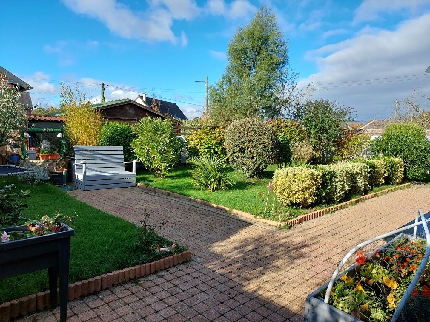 A l'extérieur : un jardin arboré sans vis à vis, un atelier attenant à la maison, à l'arrière: une autre terrasse.