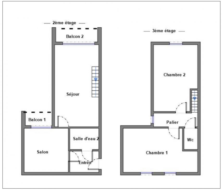 A l'étage un palier dessert deux chambres et un WC avec lave mains.
