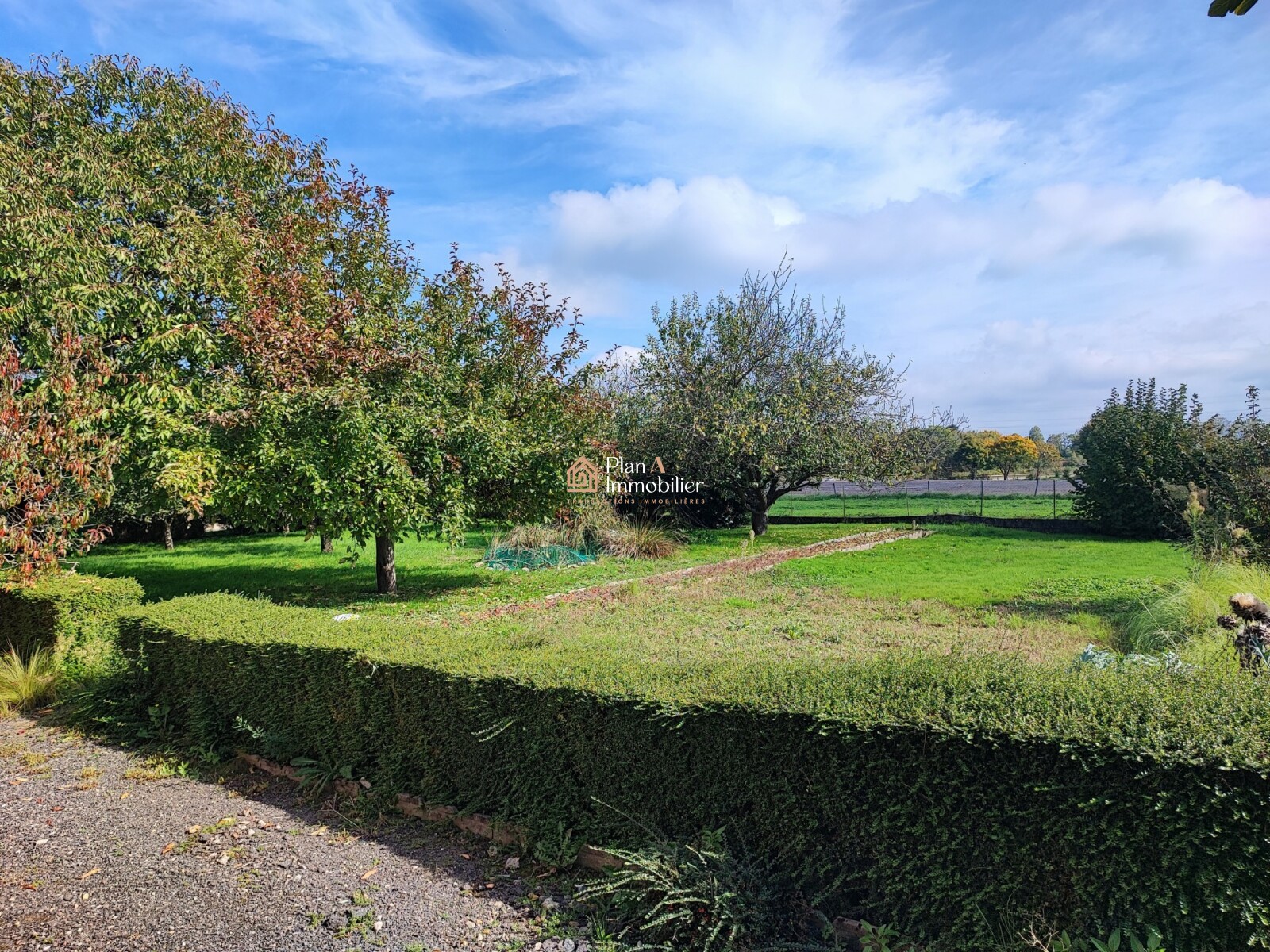 Le tout est implanté sur un grand terrain plat et arboré, idéal pour profiter des beaux jours.