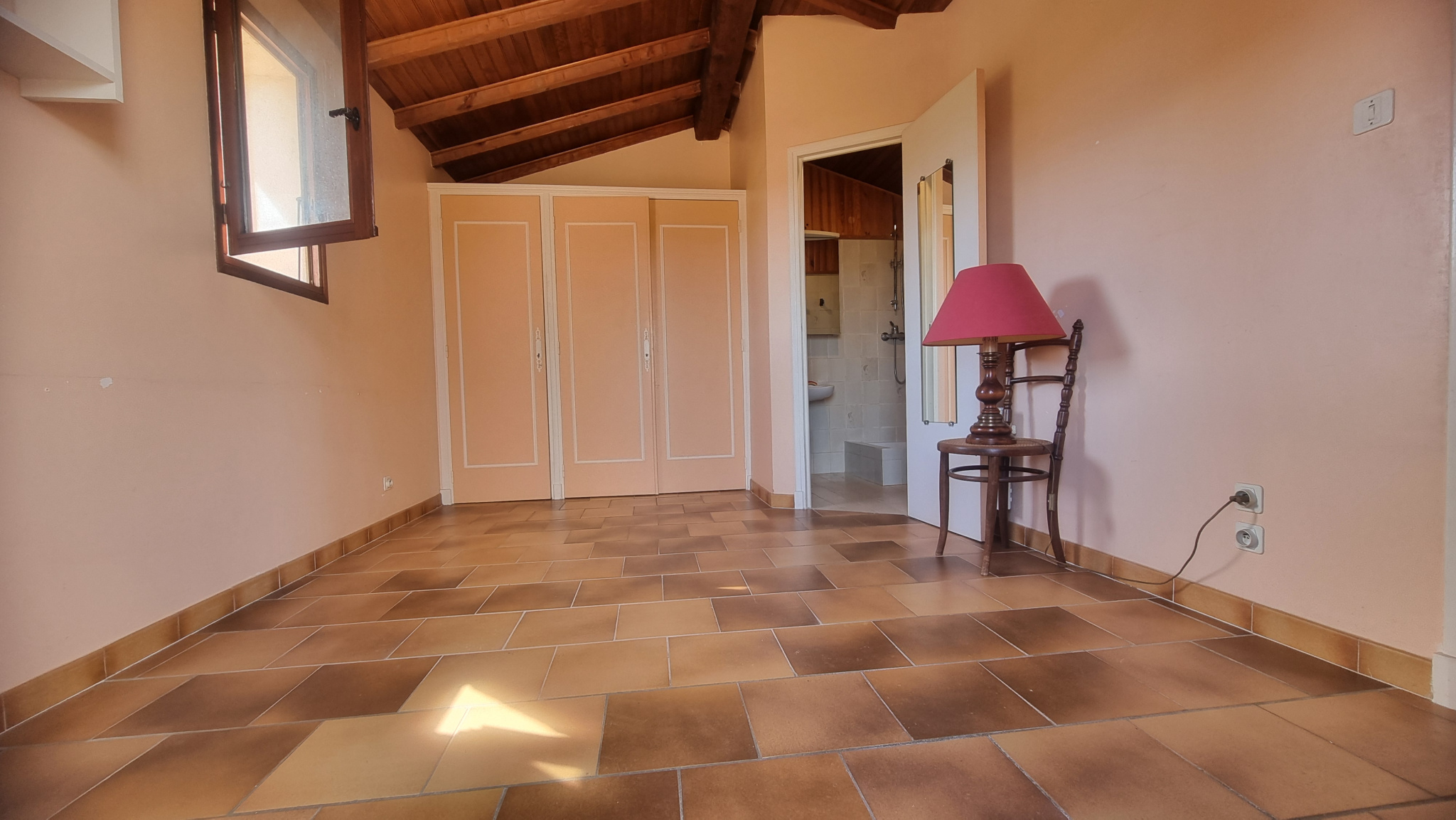 Idéale pour un peu d'intimité pour les parents ou un ado, à l'étage, une chambre avec placard, SDE et WC, terrasse solarium d'environ 12m2.