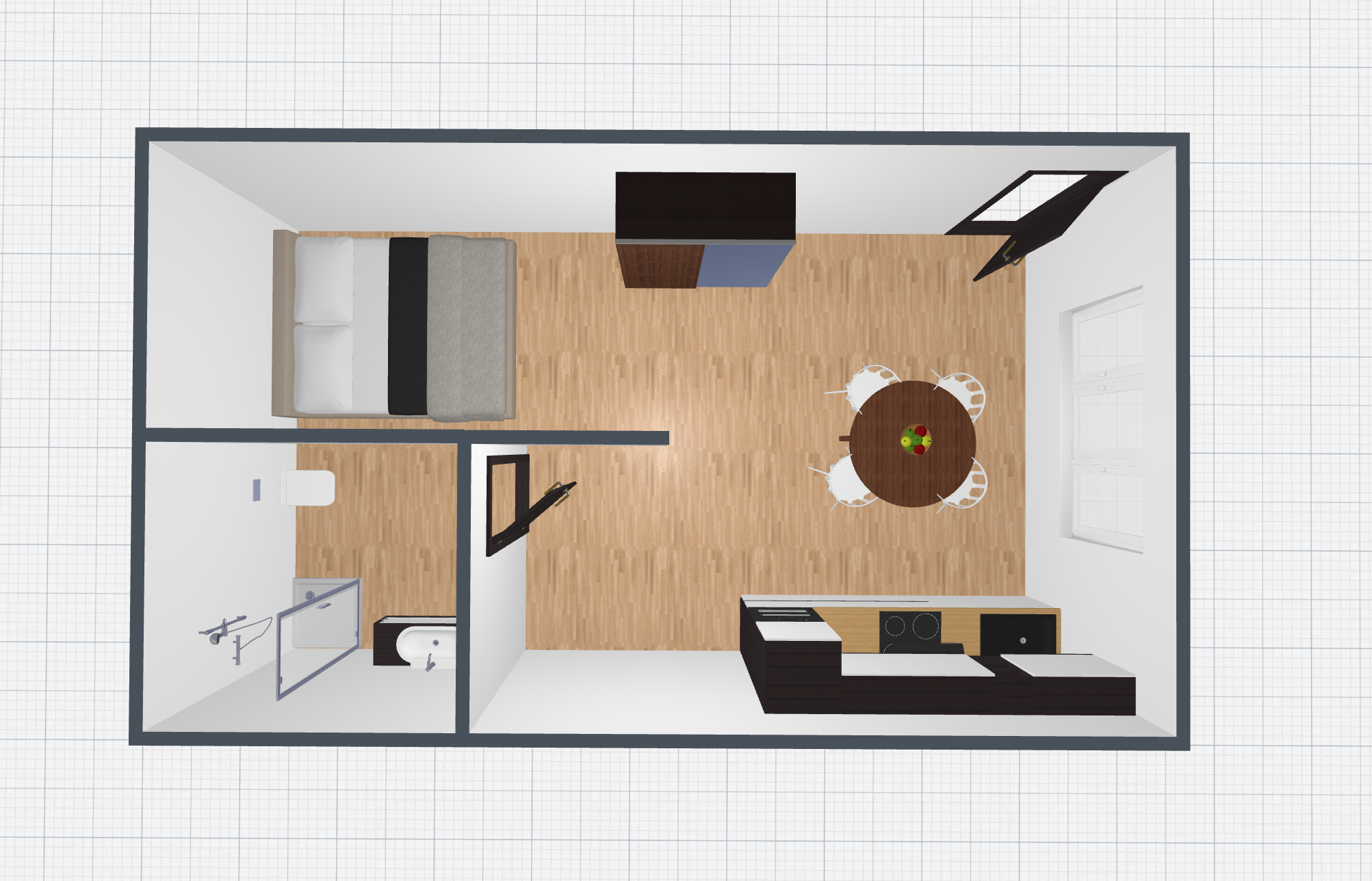 De plain-pied, il est composé d'une belle pièce de vie, d'une terrasse en bois autoclave et d'une place de stationnement en extérieur.