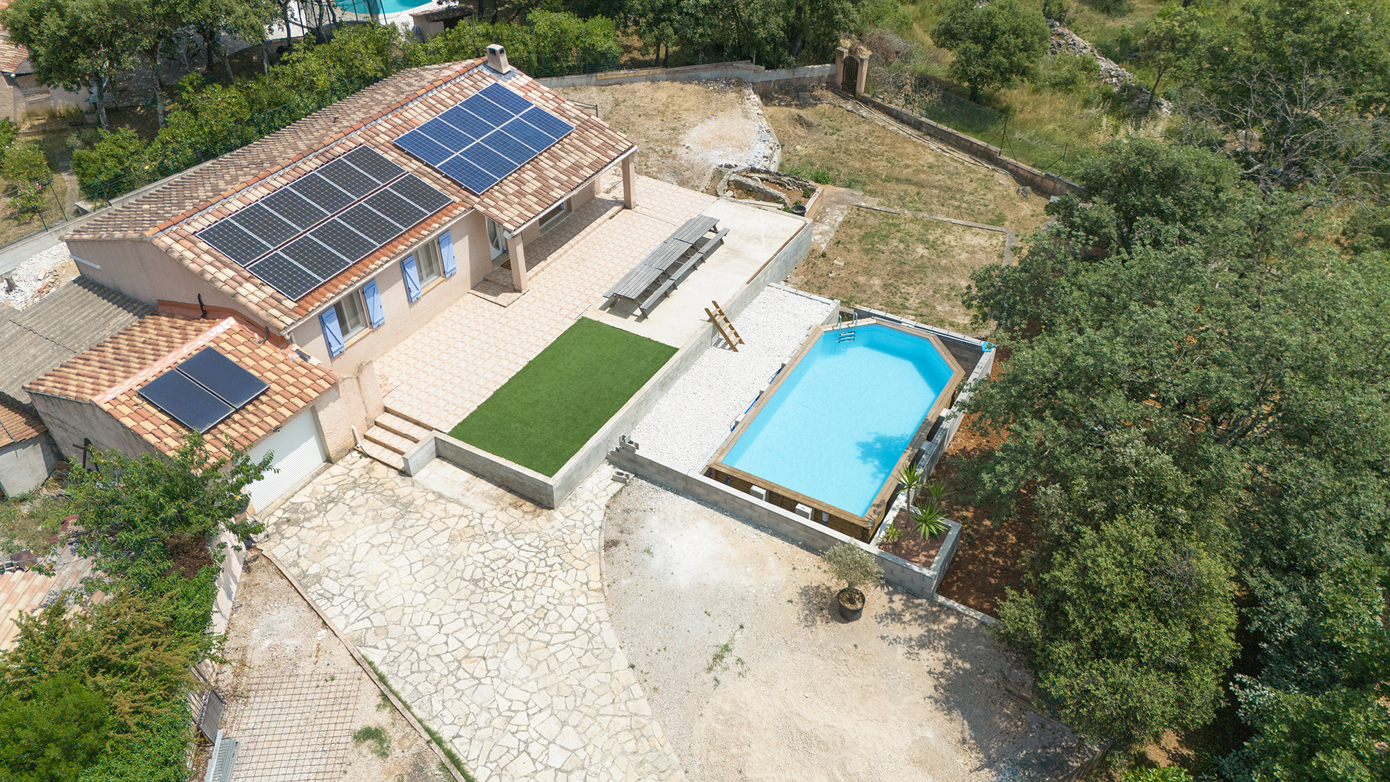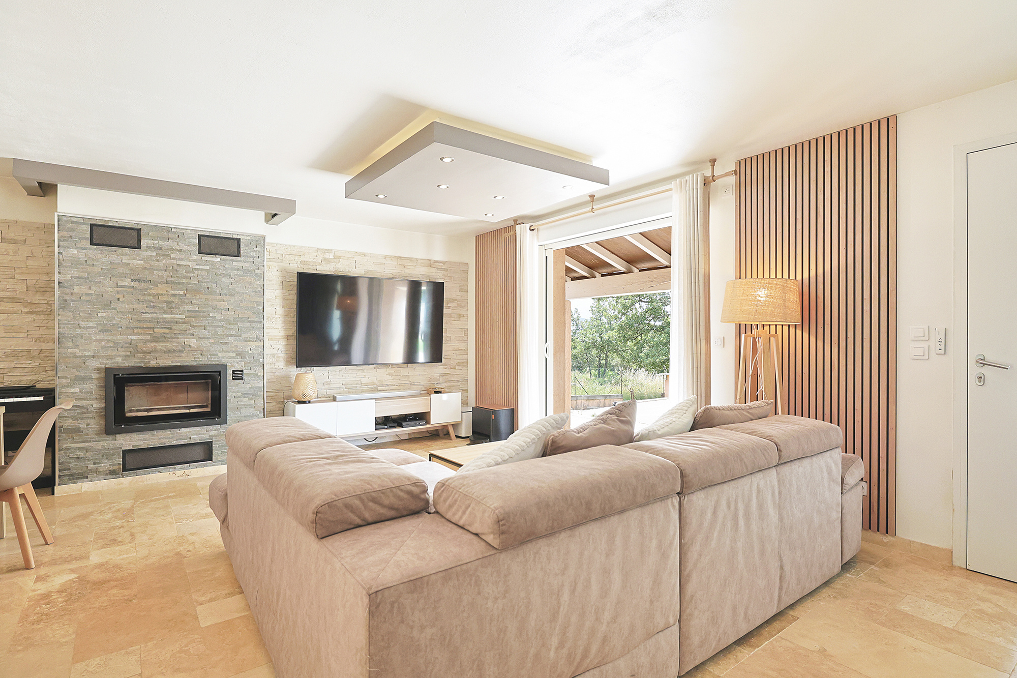 Prestations : panneaux photovoltaïques pour l'autoconsommation + panneaux photovoltaïques pour la revente (environ 1600EUR annuel) / Chauffage : cheminée, climatisation réversible x2, convecteurs électriques / Raccordement : eau de ville + fosse septique à remettre aux normes / Menuiseries : baies aluminium galandages, double vitrage PVC oscillo-battant, moustiquaires, volets roulants électriques, volets bois.