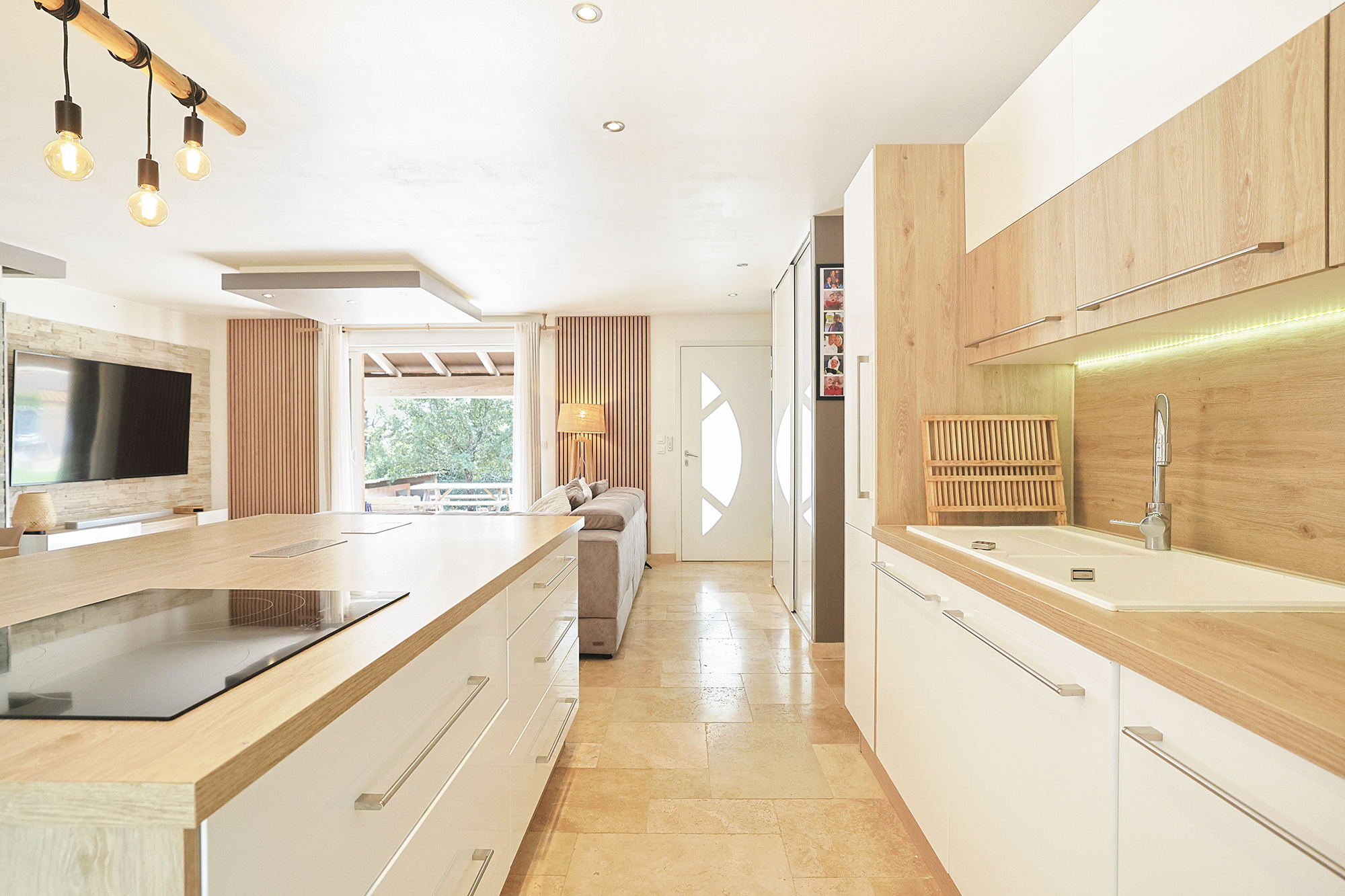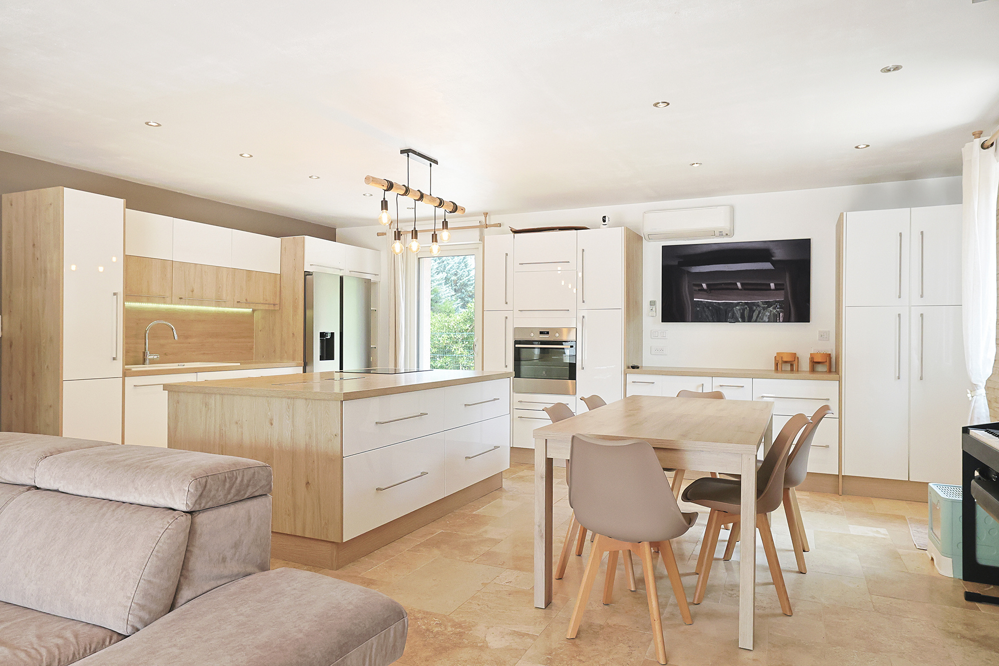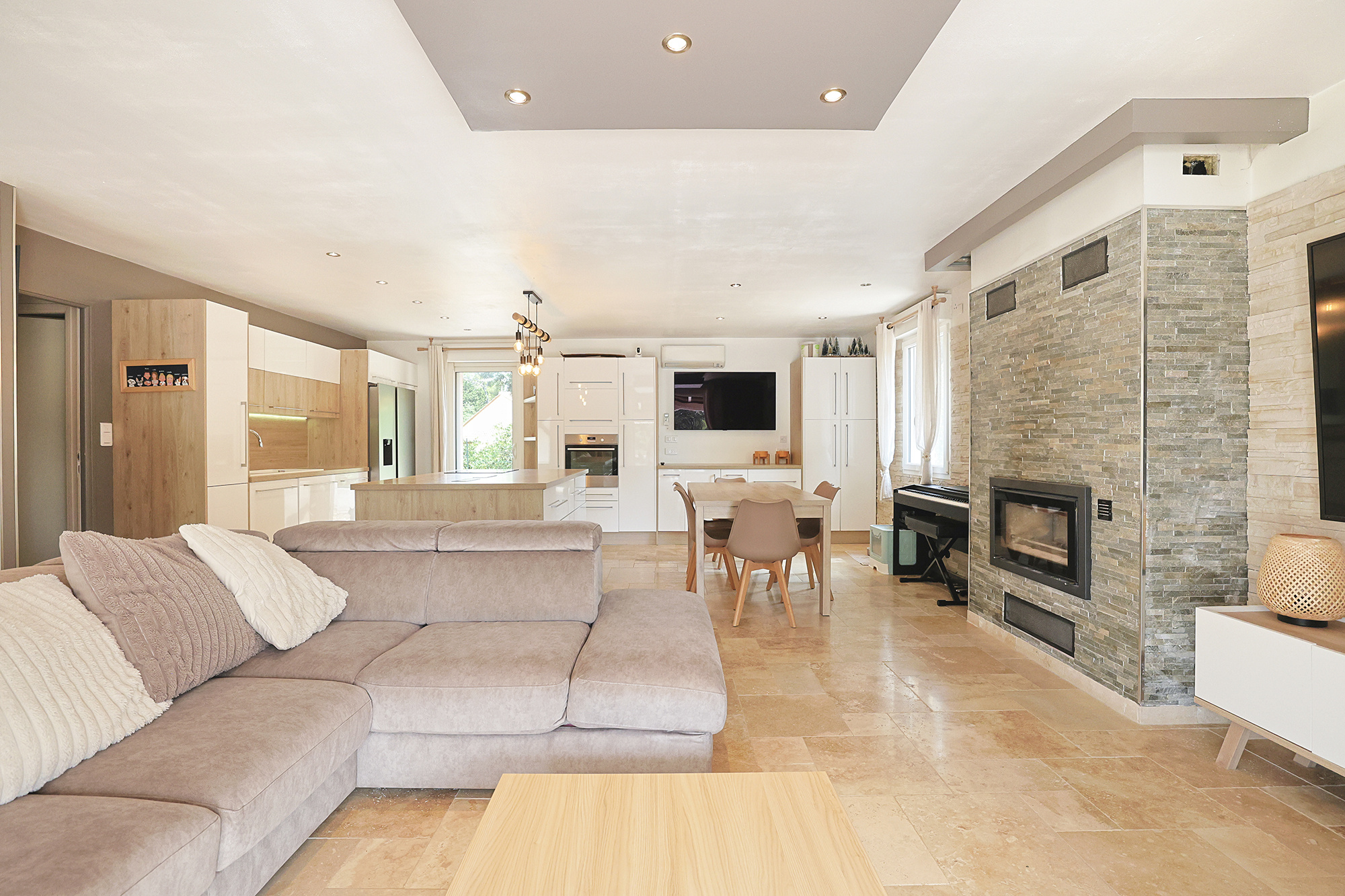 À l'intérieur : la maison s'ouvre sur une pièce de vie de 46m2 comprenant salon, salle à manger, cuisine américaine avec îlot central, baies à galandages, climatisation réversible, cheminée et placard.