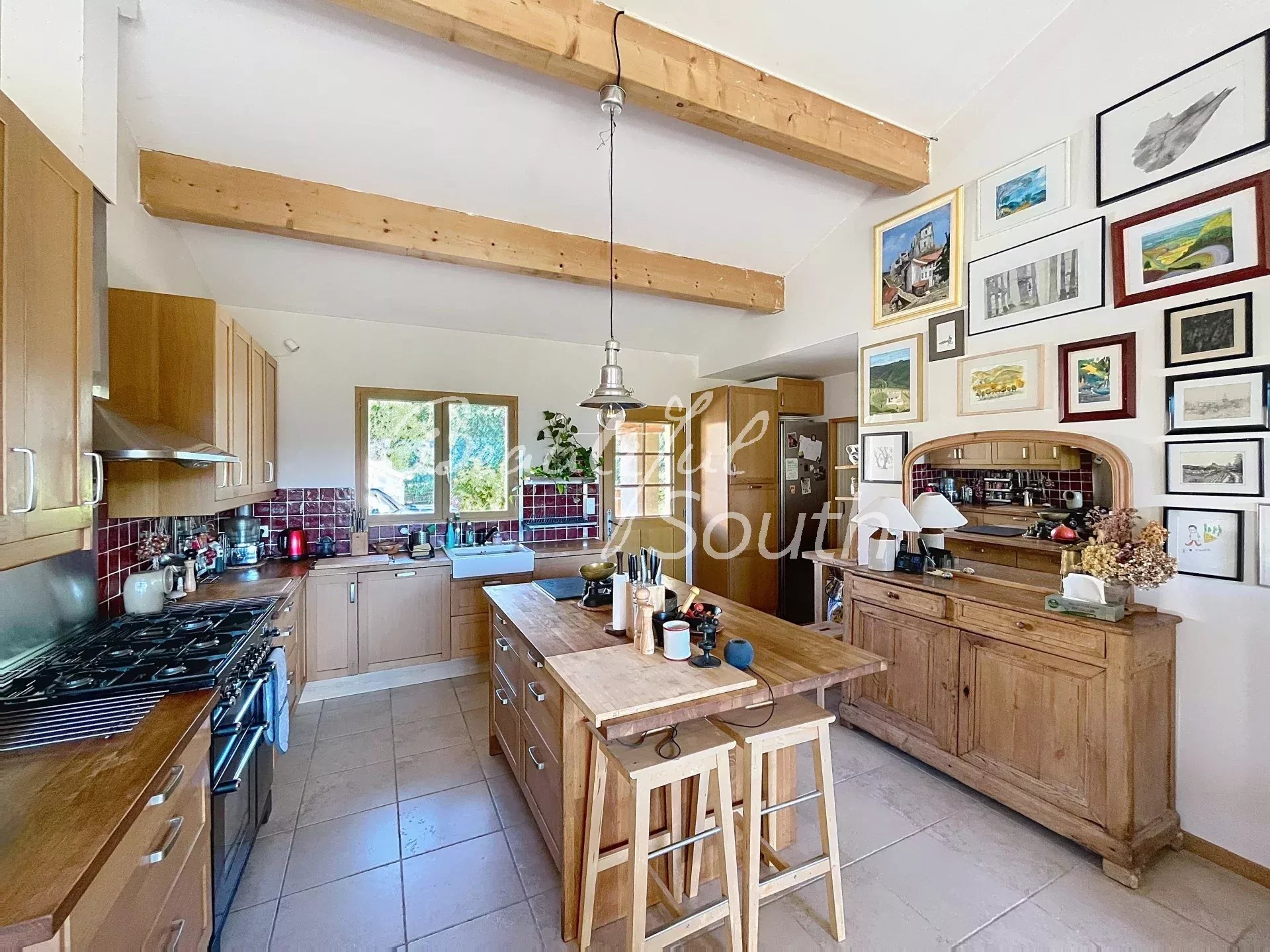 La terrasse en bois de 40 m², orientée sud, invite à profiter du soleil et du panorama. Le terrain de 5 642 m² comprend jardin et verger biologiques, oliviers, vignes et espaces ouverts. Piscine 8x4 m, garage et carport pour deux voitures.