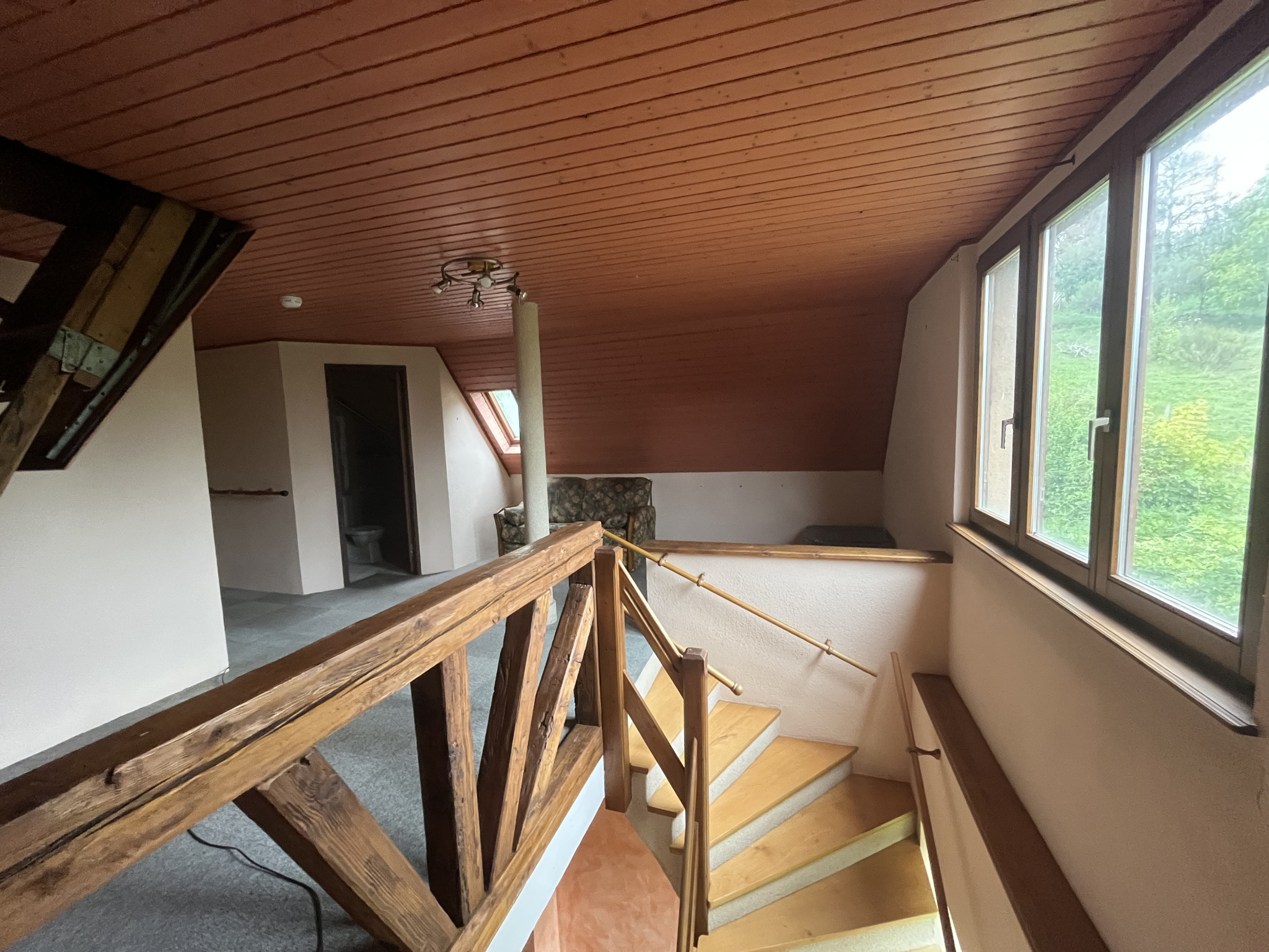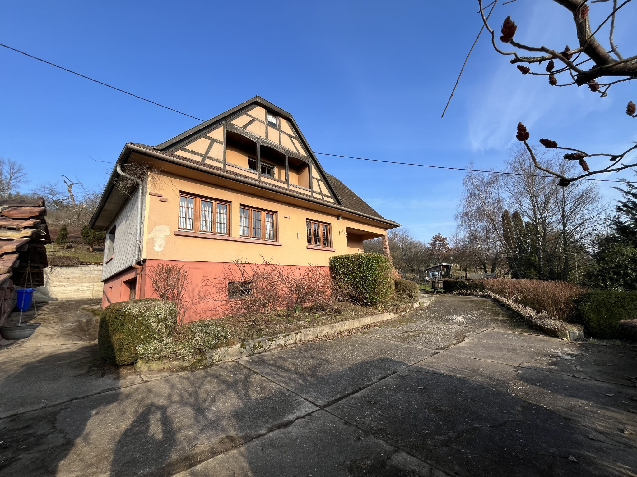 Sur les hauteurs de Villé, une très belle situation dominante plein Sud pour cette maison des années 1960 d'une surface de 125 m2 avec un bon portentiel et un grand terrain de près de 18 ares (avec partie constructible), comprenant en sous-sol une cave, au rez-dechaussée une entrée, une cuisine, un salon, une salle à manger, une chambre, un WC et une salle de bains, à l'étage une mezzanine, une chambre, un WC et une partie grenier aménageable en chambre avec un balcon plein Sud.