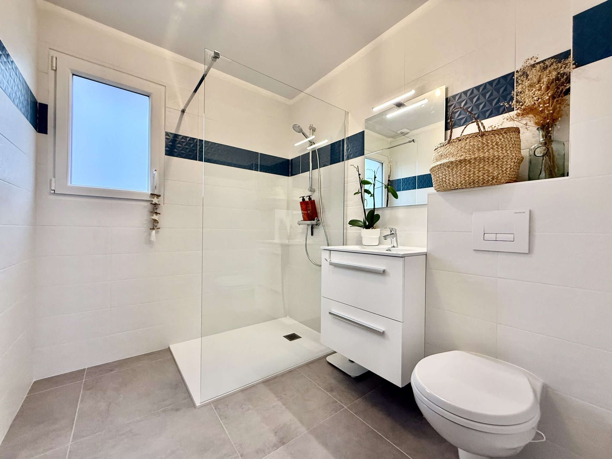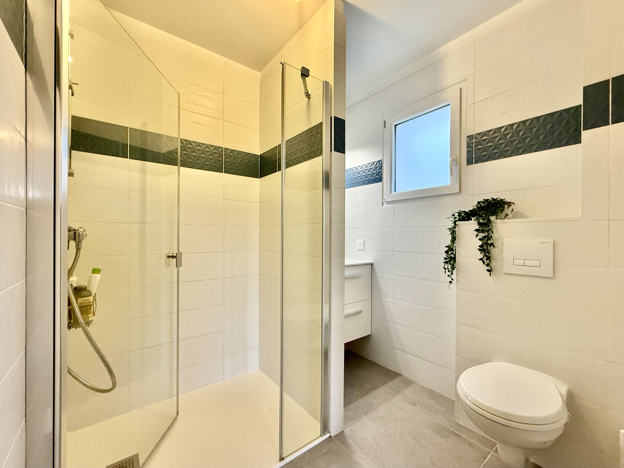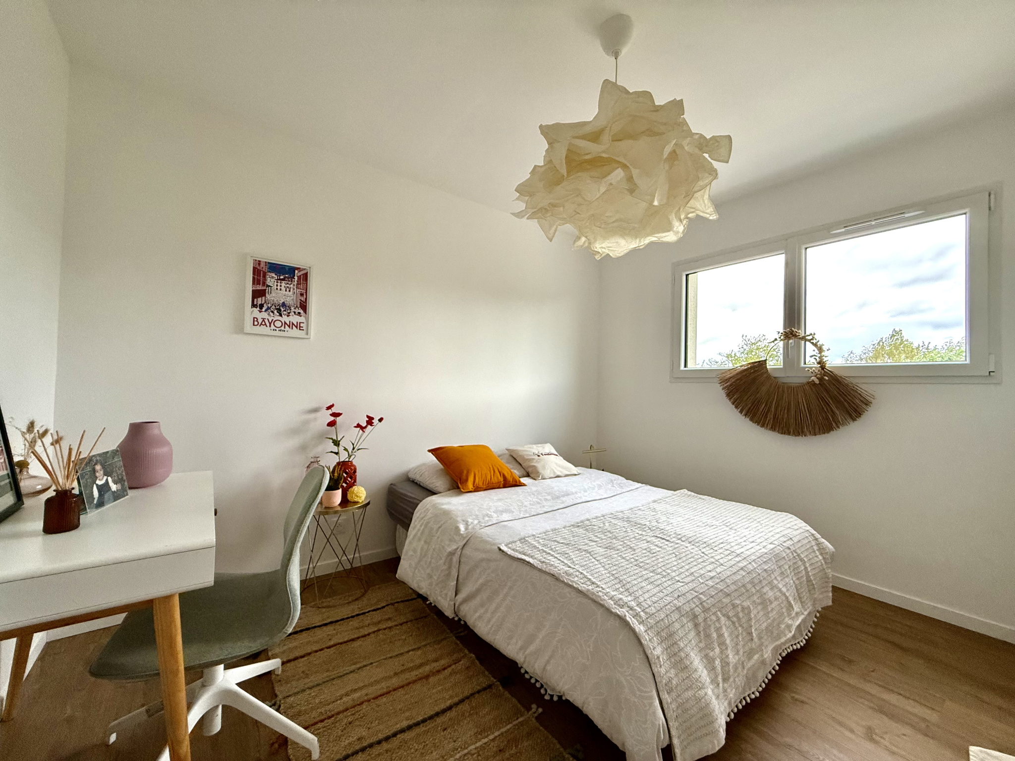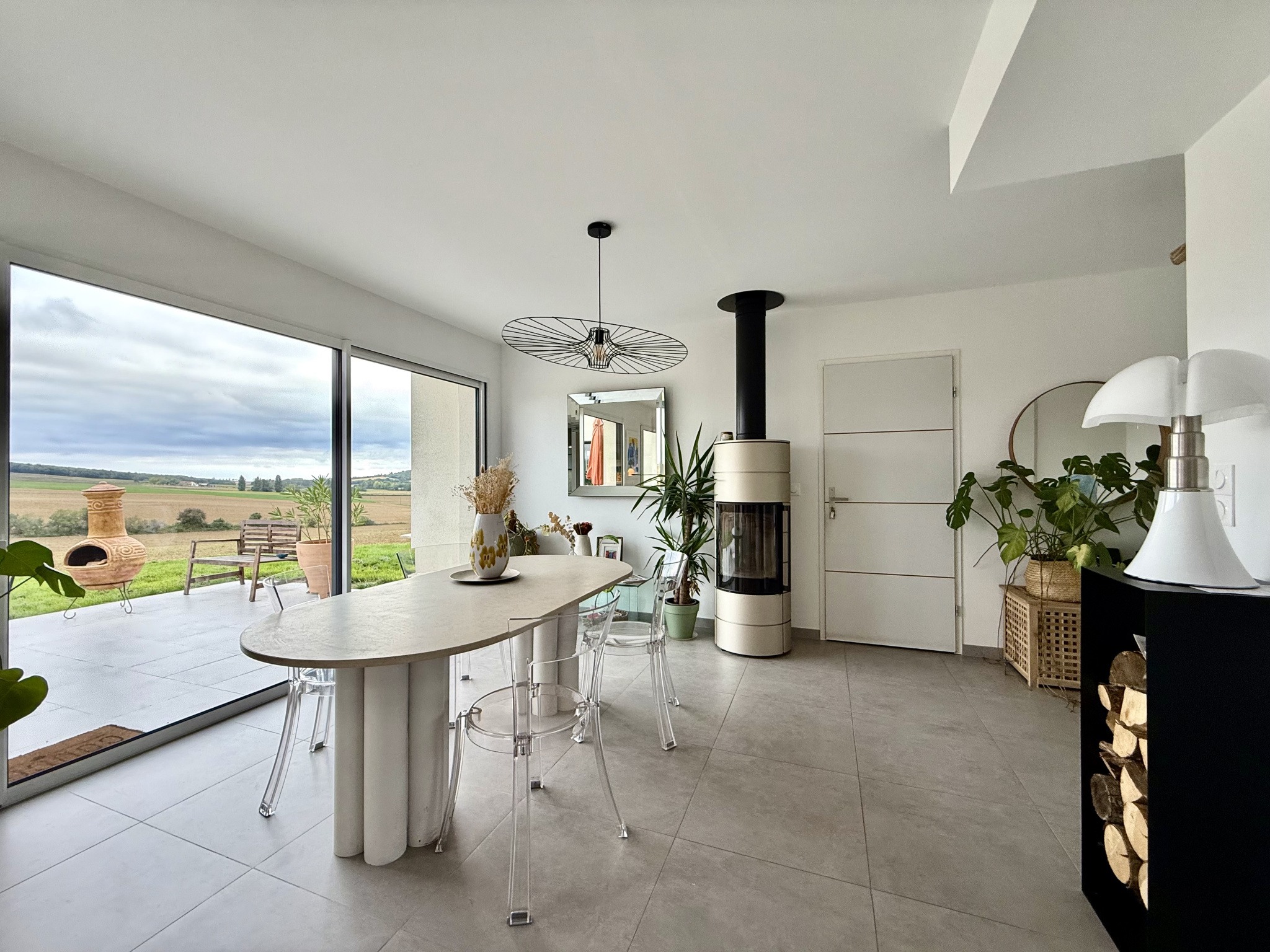 L'entrée s'ouvre sur un espace de vie très lumineux et donnant accès directement à la terrasse de 30m2 orientée plein sud.