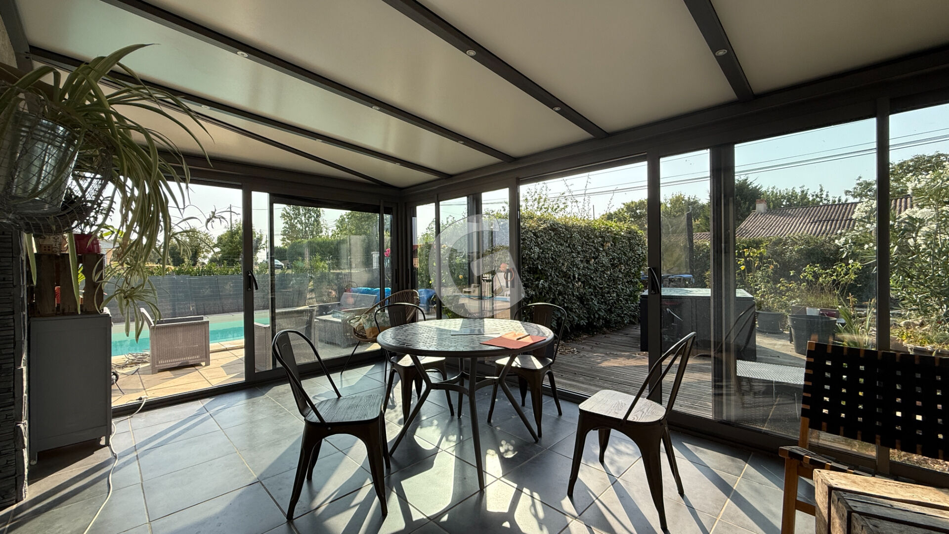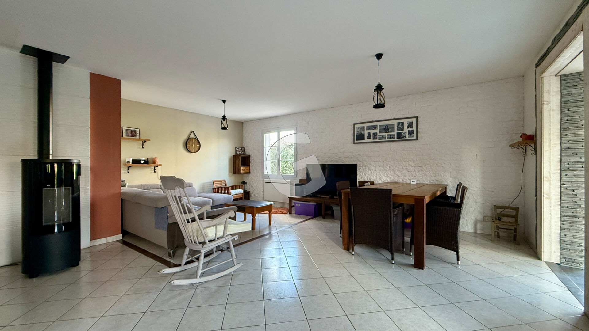 Elle dispose d'un vaste séjour équipé d'un poêle à granulés, ouvert sur une cuisine aménagée fonctionnelle, ainsi qu'une véranda récente offrant un bel espace supplémentaire de vie.