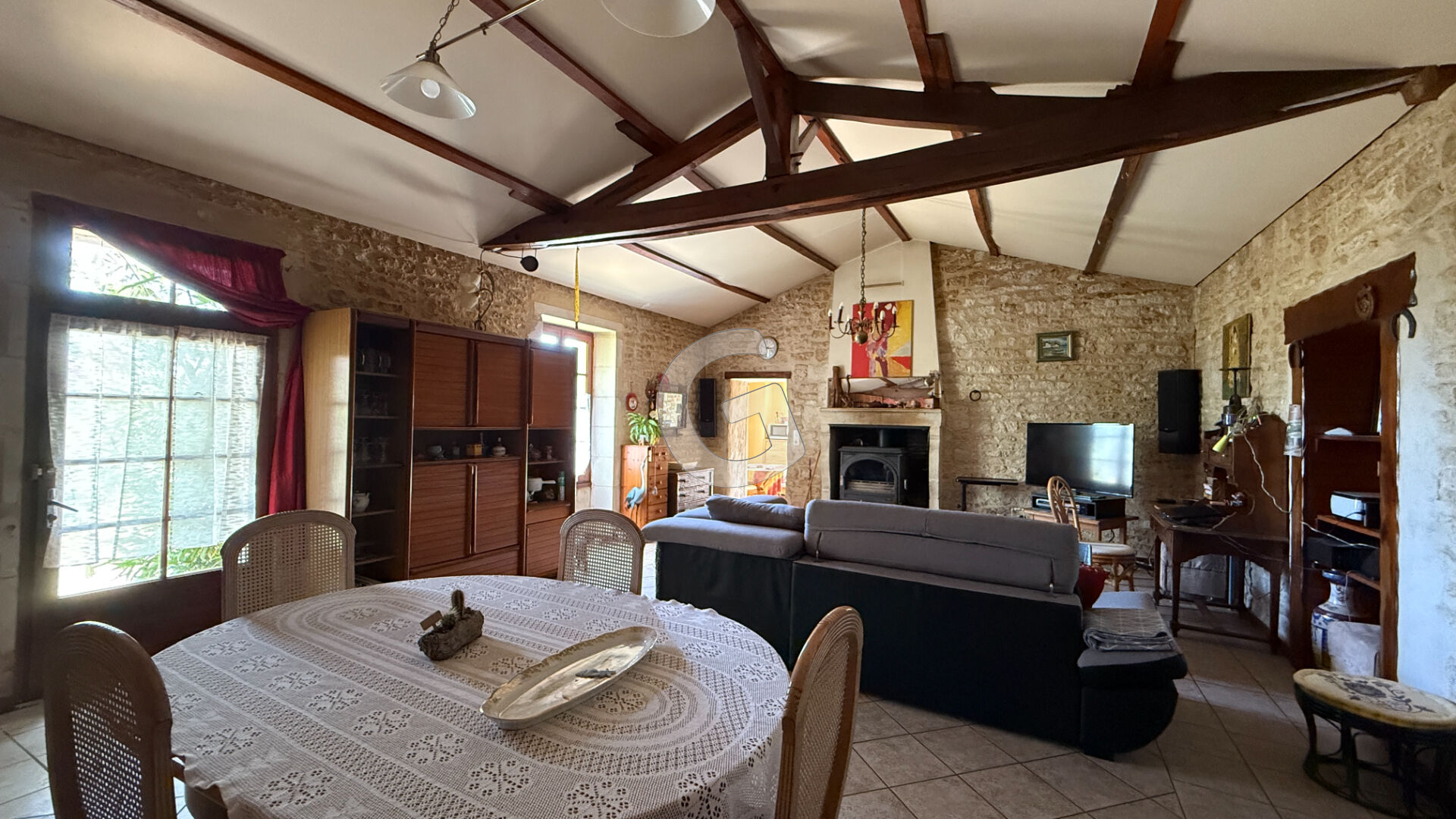 Cette belle maison familiale se compose d'un vaste salon-séjour baigné de lumière, agrémenté d'un poêle à bois et d'une grande hauteur sous plafond, créant une atmosphère chaleureuse et conviviale.