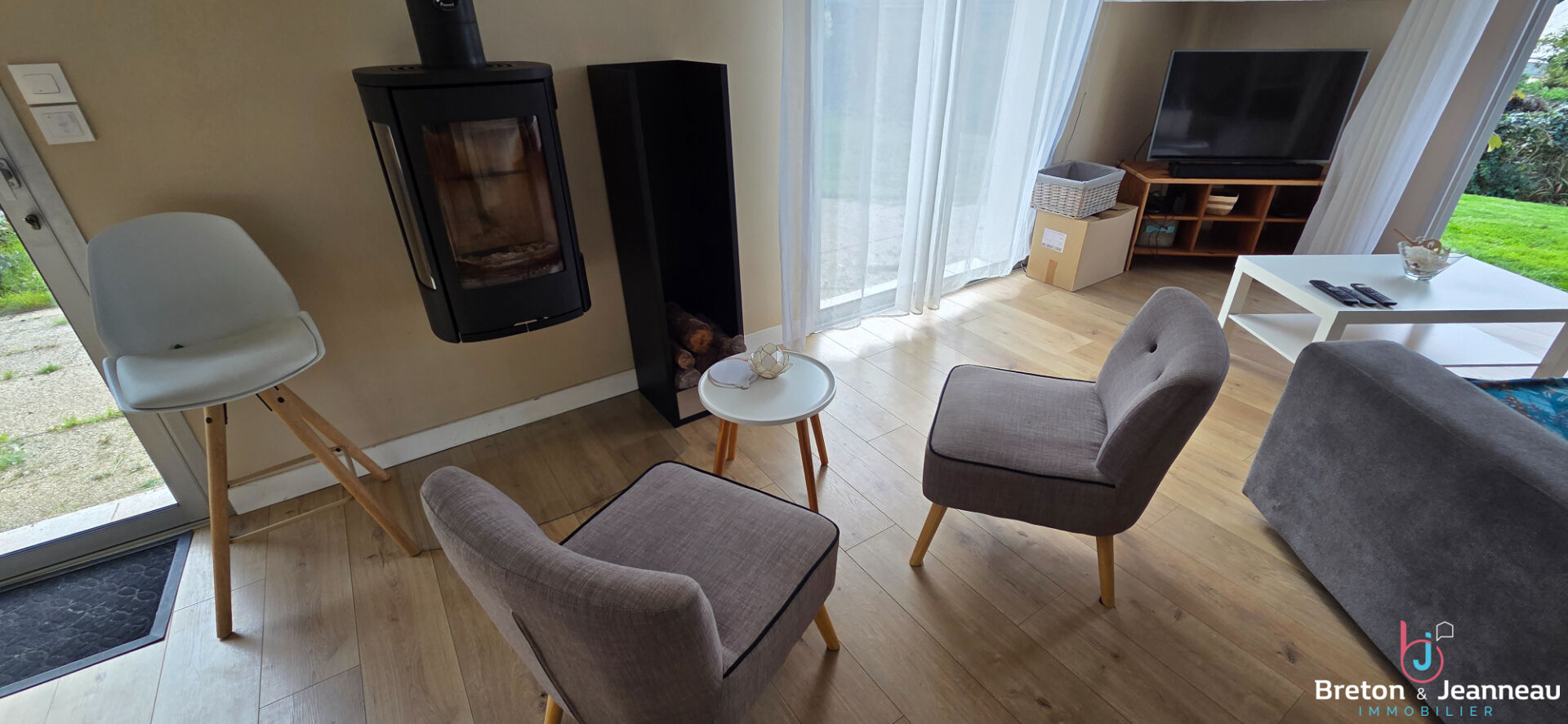 La cuisine aménagée et équipée, les ouvertures en aluminium à double vitrage, et un poêle à bois récent complètent ce bien. Le sous-sol ajoute une touche de praticité supplémentaire.