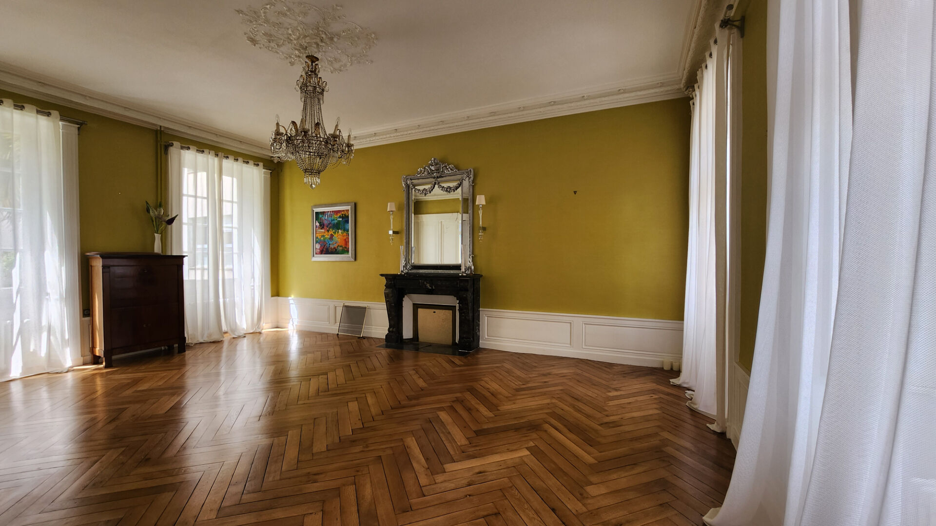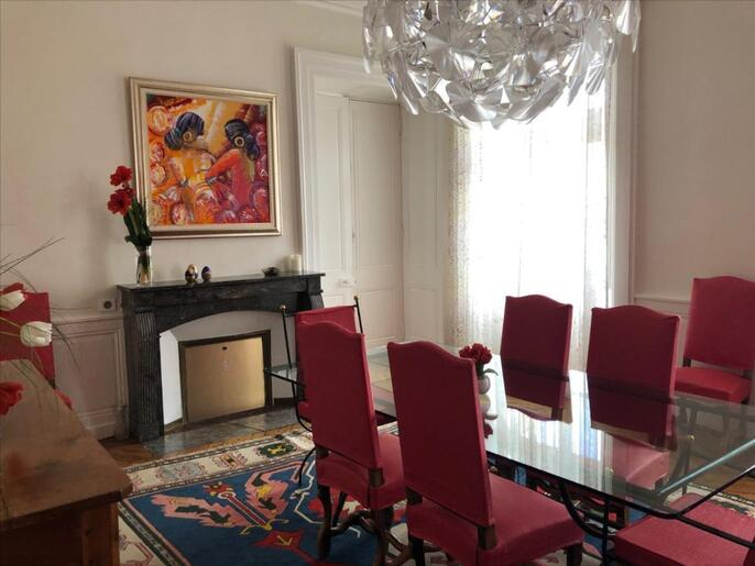 Une salle à manger élégante, également en parquet.