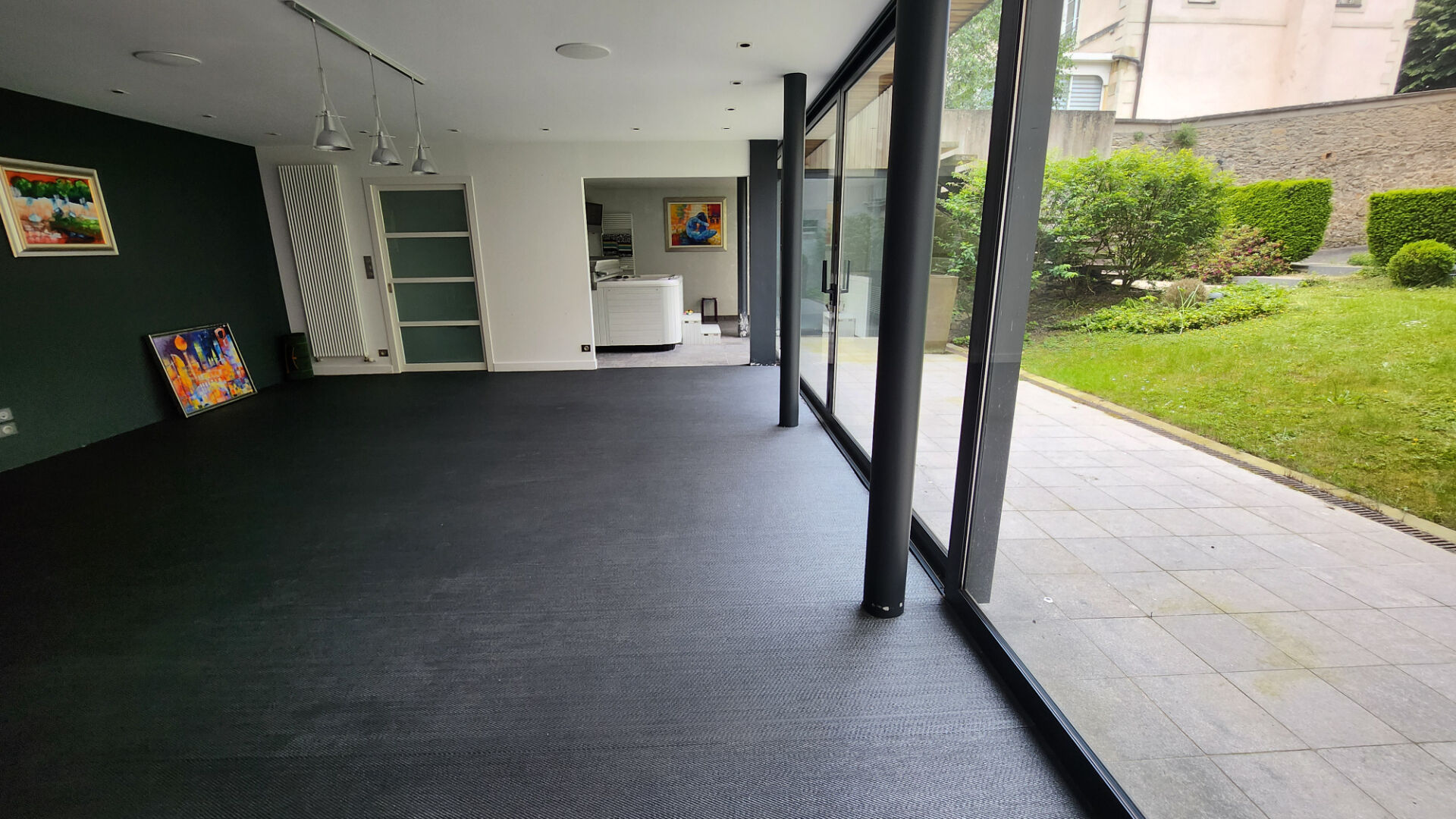 Une salle de sport moderne avec espace SPA, douche et WC.