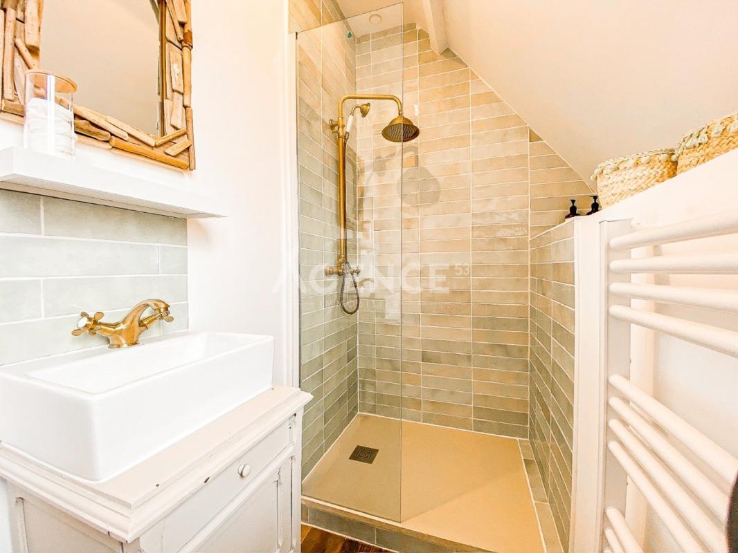 Un large escalier d'origine, bordé de murs en briques rejointoyées, conduit à l'étage, où le palier dessert quatre grandes chambres, un dressing et une salle d'eau avec WC.