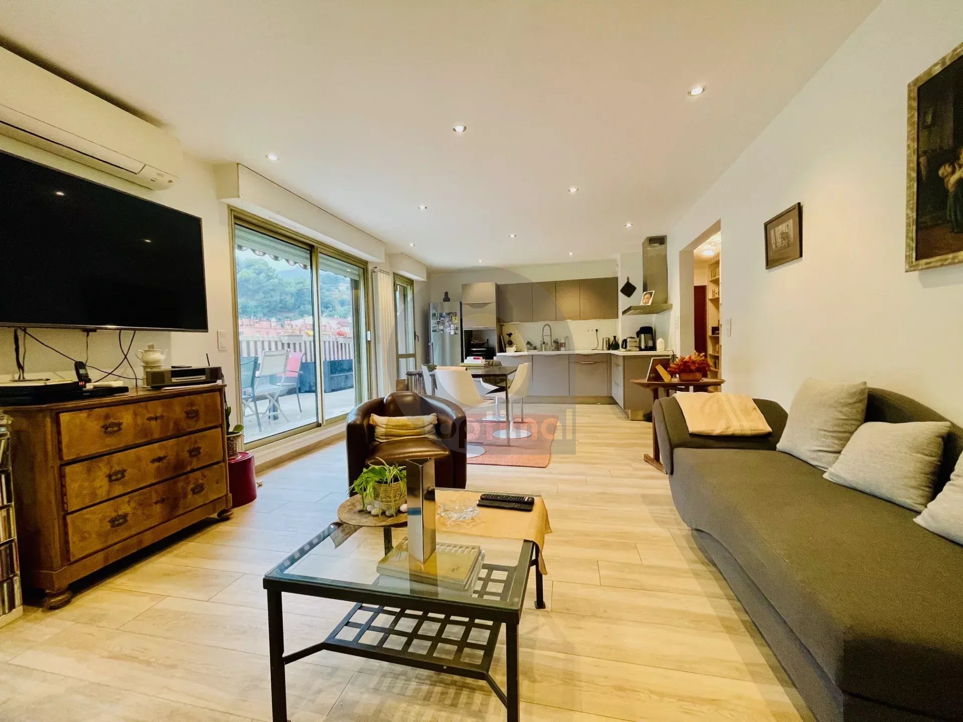 En parfait état, TRAVERSANT (Est / Ouest) comprenant un agréable séjour avec cuisine US de 32.50m², 2 belles chambres, nombreux placards, spacieuse salle de douche et WC indépendants, 2 TERRASSES totalisant 47m² bénéficiant d'une jolie vue dégagée sur les collines.