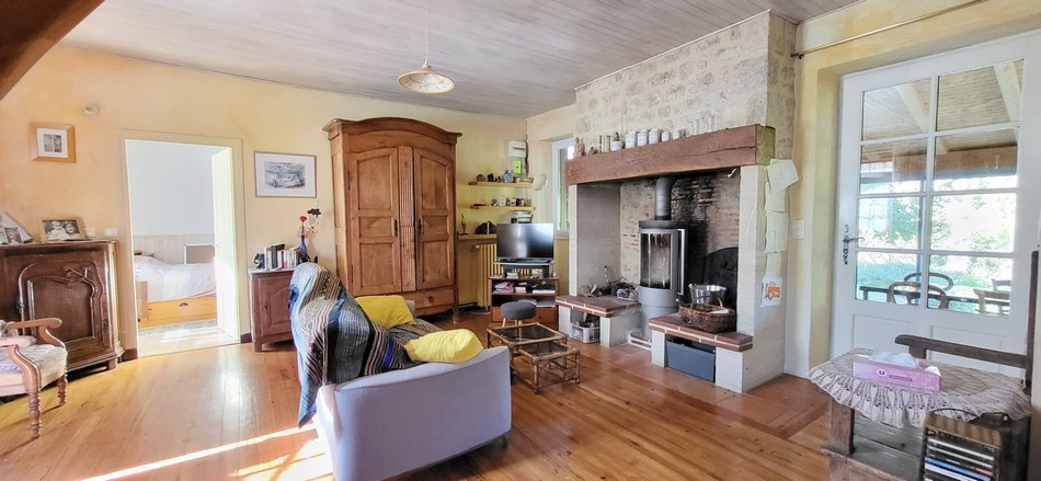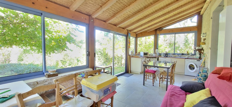 Ensemble immobilier en bon état composé d'une maison en pierre, 2 dépendances et une piscine.
