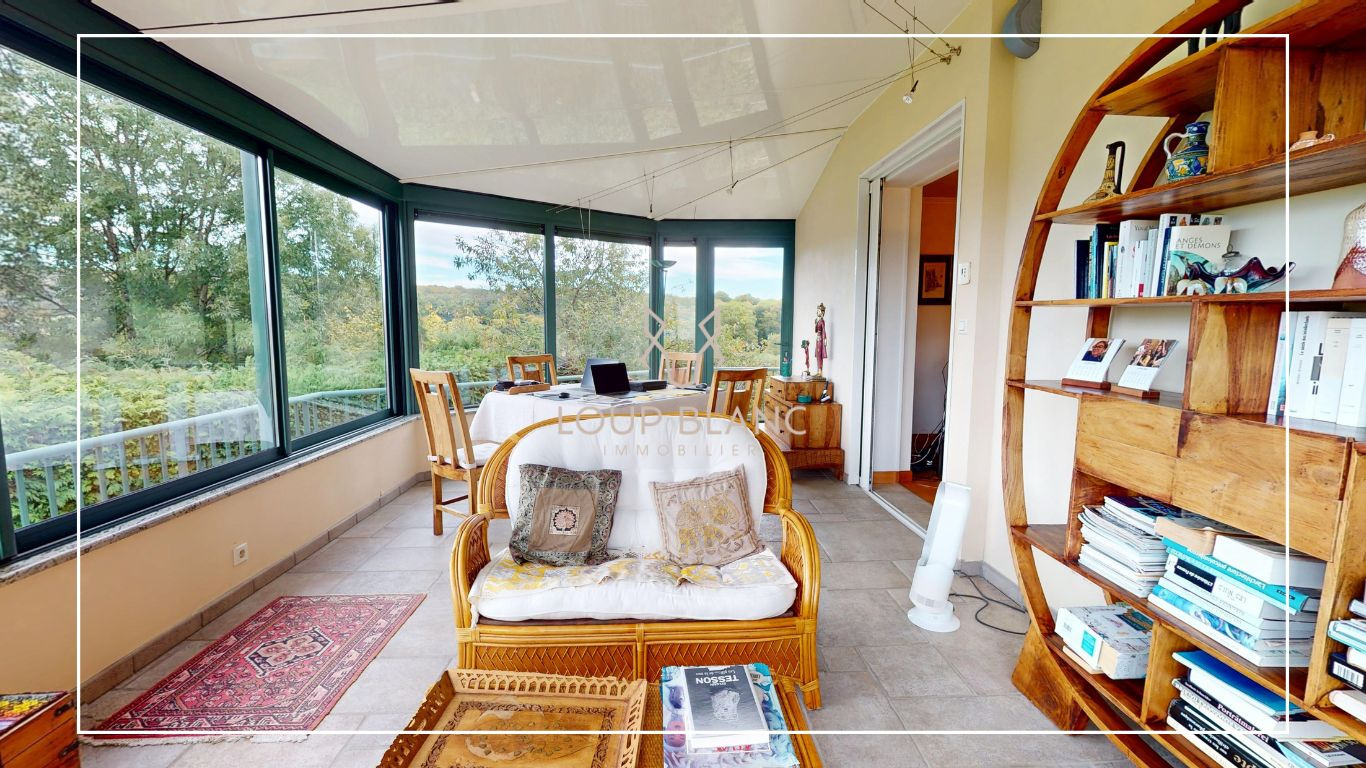 En son premier niveau, vous trouverez un vaste hall d'entrée, desservant une cuisine avec accès à la terrasse, une pièce de vie de 32m2, desservant à une véranda chauffée de 22m2, une salle d'eau, deux chambres et un WC séparé.