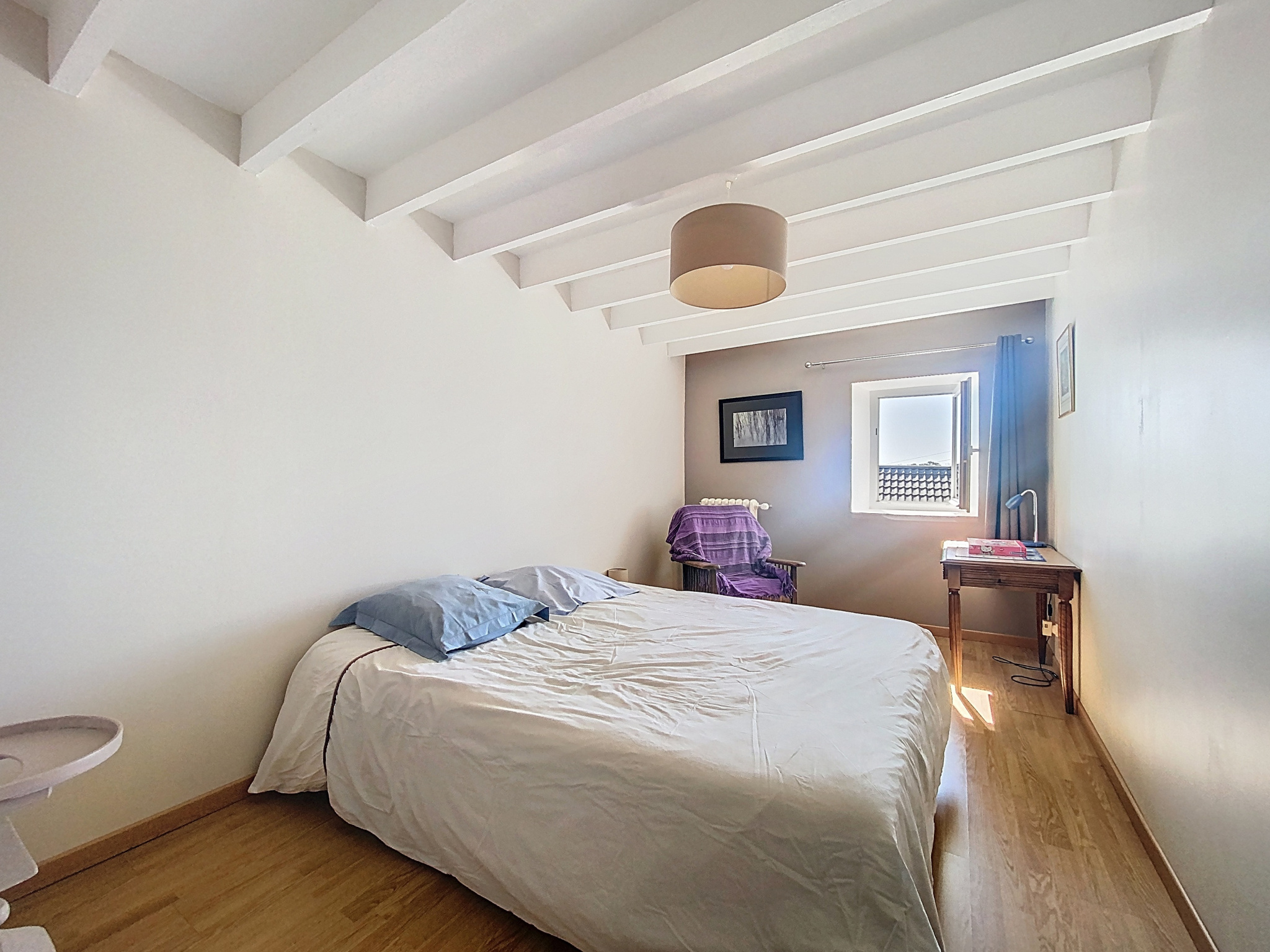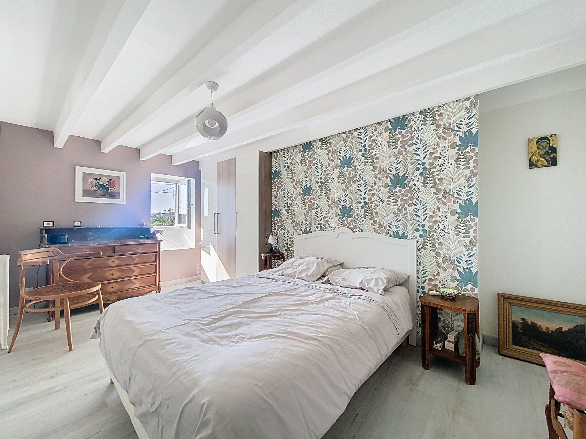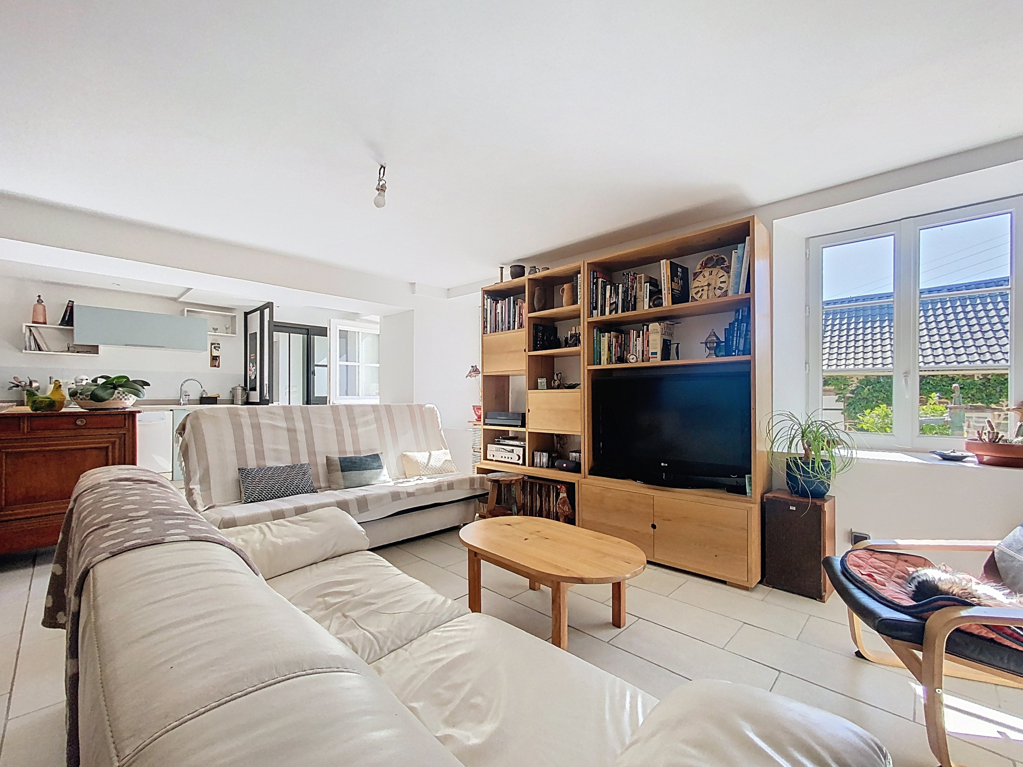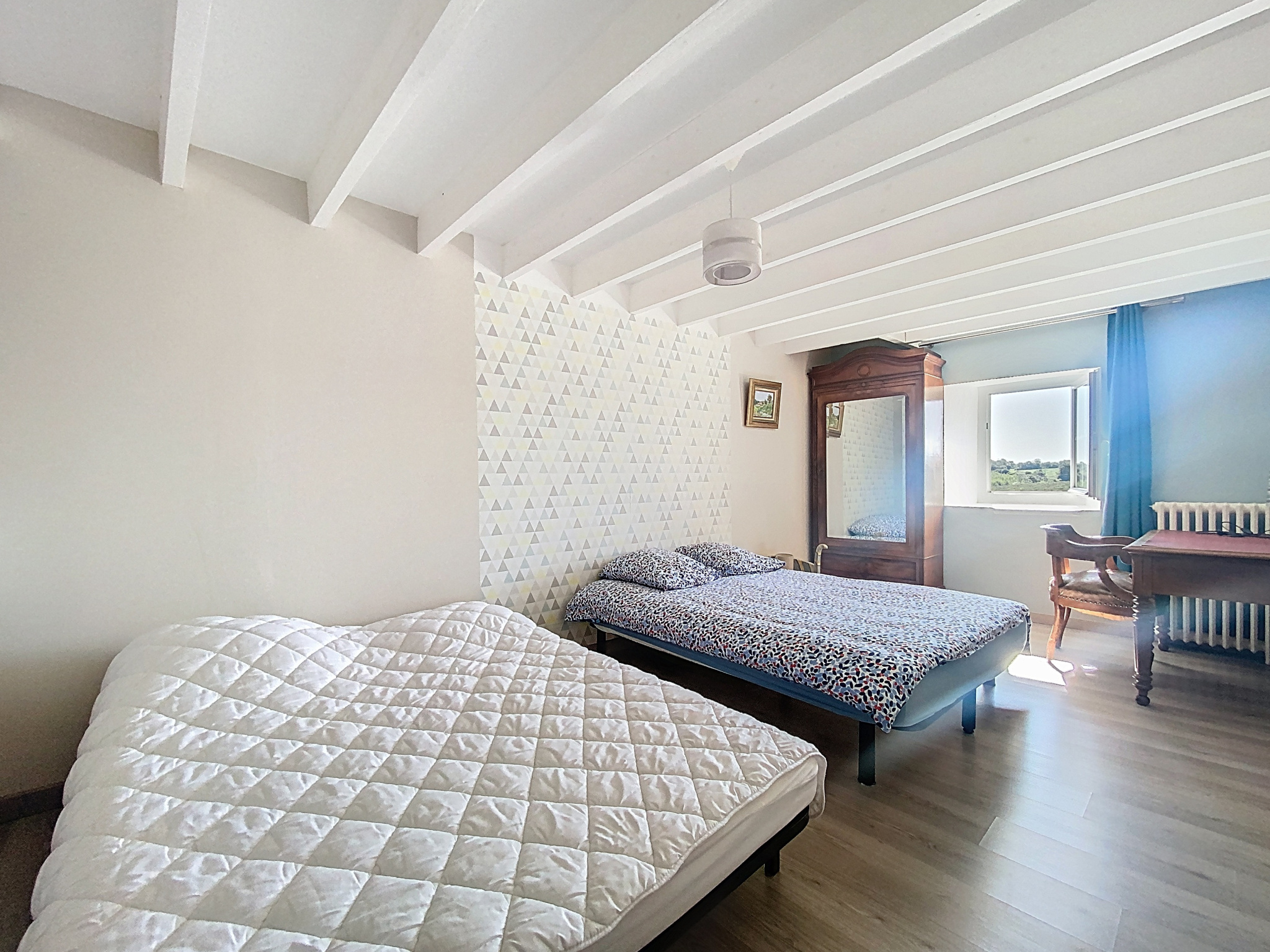 La maison principale de 100m2 habitable comprend une entrée avec cuisine ouverte sur un salon/séjour lumineux, un bureau et un WC. À l'étage, un palier dessert trois chambres et une salle d'eau avec WC.