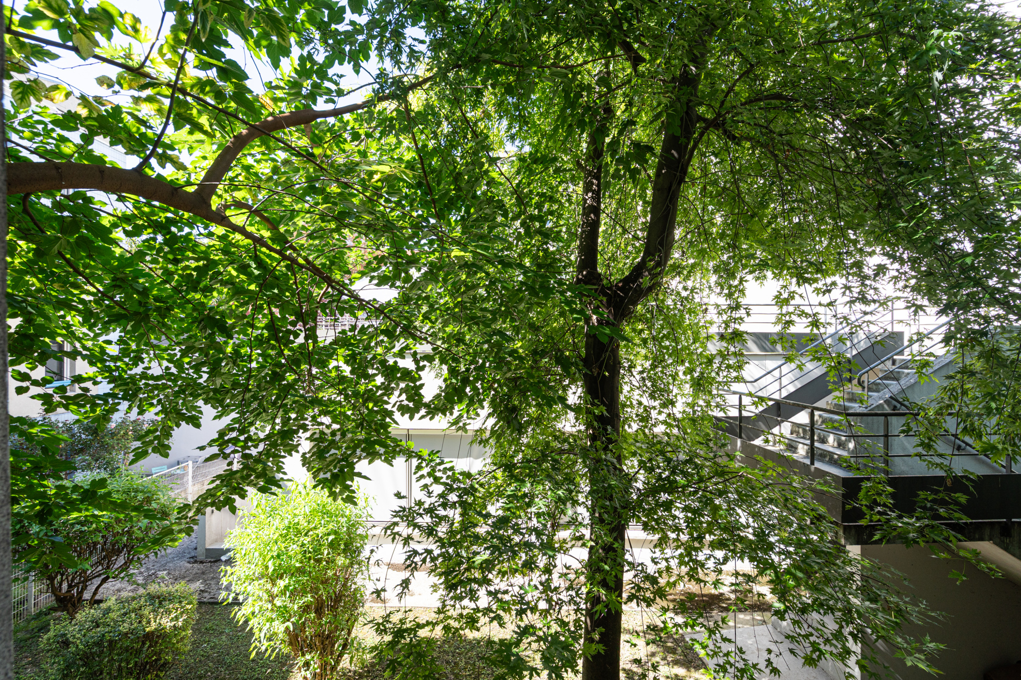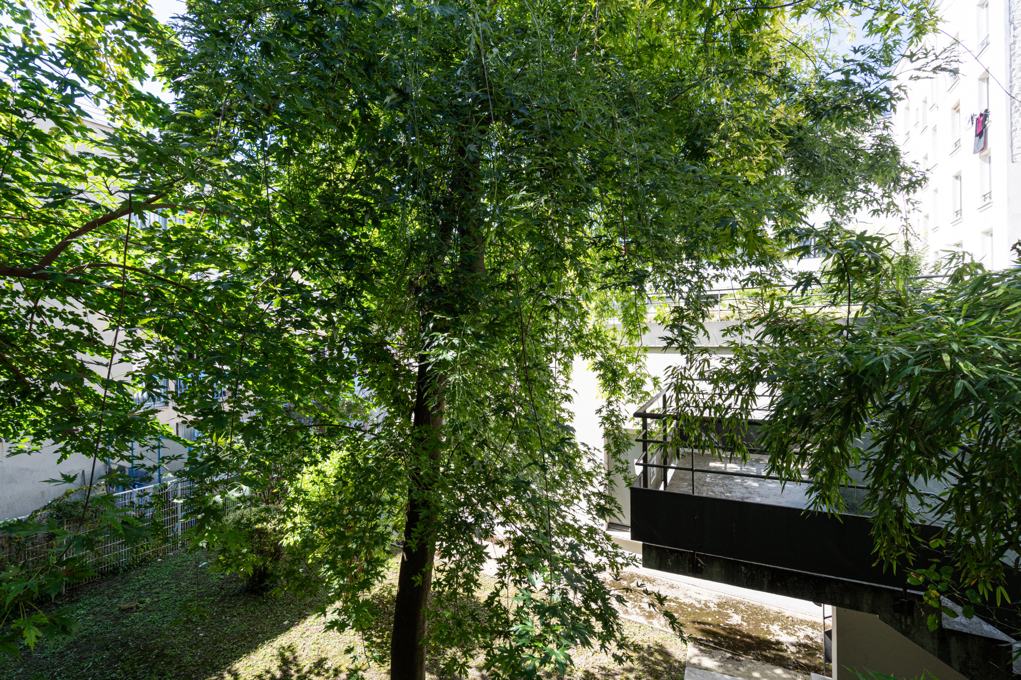 Dès l'entrée, le séjour plante le décor d'un bien au caractère unique : une vue arborée, au calme et sans vis-à-vis. Les larges ouvertures par baies vitrées donnent en effet sur une école d'architecture et une cour verdoyante, procurant luminosité et sensation de sérénité.