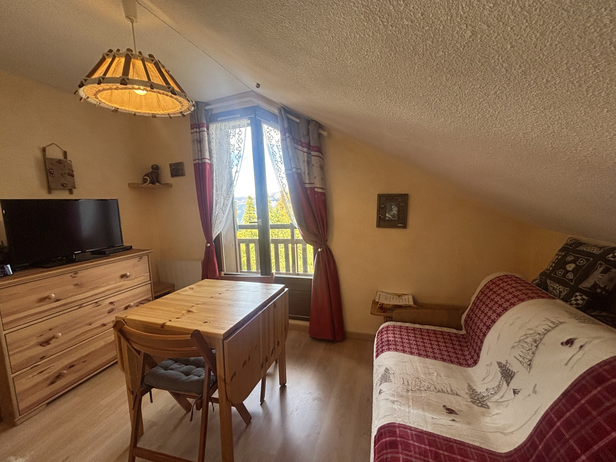 Une pièce de vie, une kitchenette équipée et un séjour ouvrant sur un balcon exposé NORD avec une très jolie vue sur la vallée.