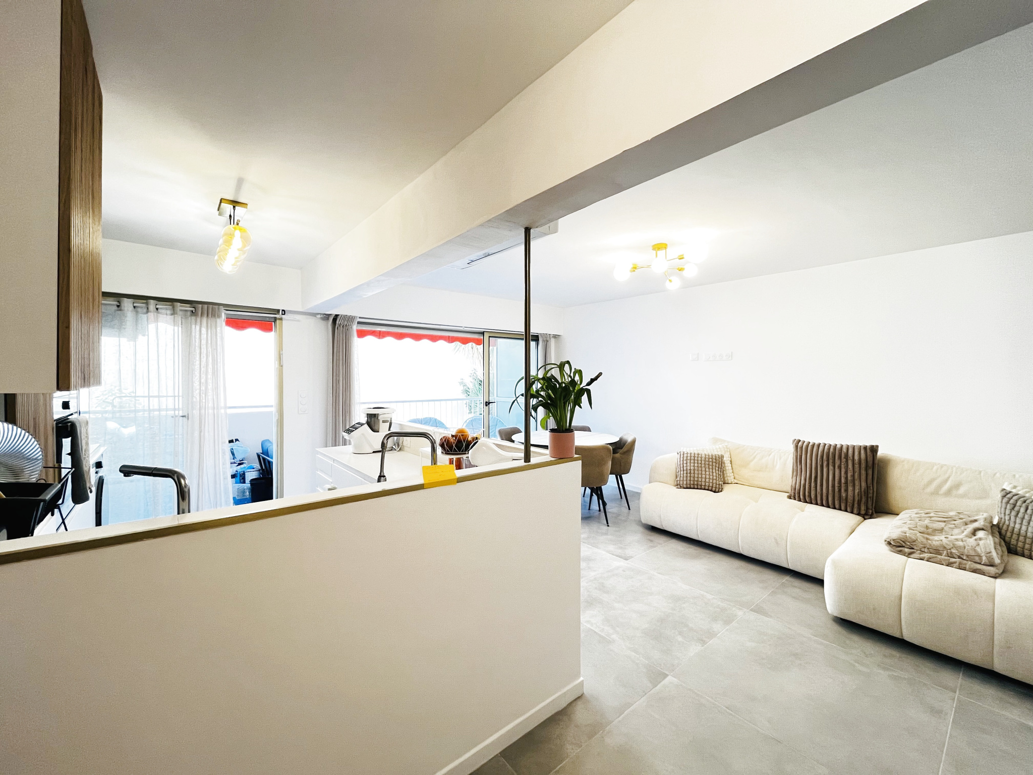 Séjour de 30 m2 avec cuisine américaine équipée,baigné de lumière grâce à son exposition plein Sud, il offre une terrasse ensoleillée sans vis-à-vis, idéale pour profiter du soleil azuréen.
