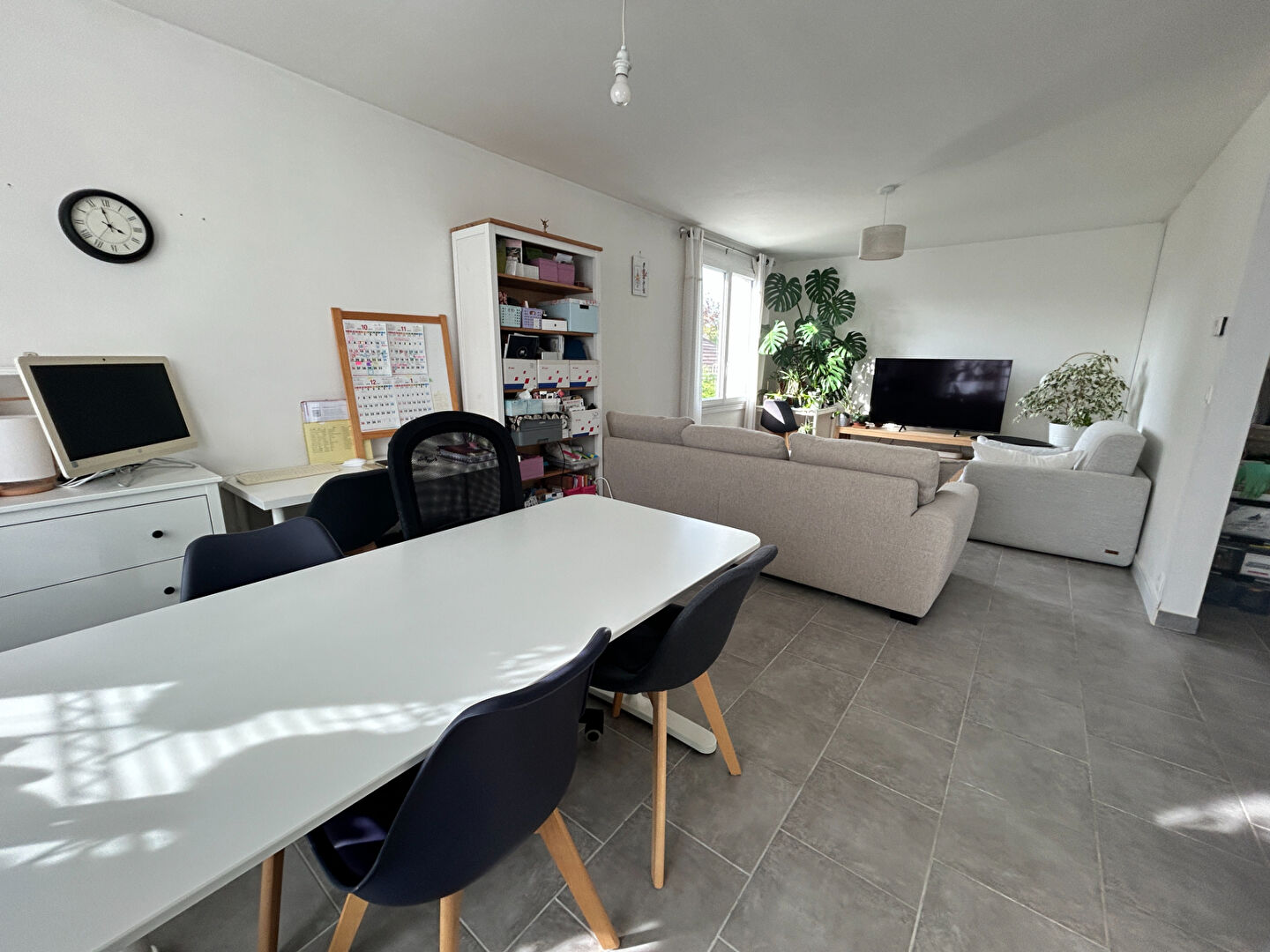 À l'étage : un salon-séjour lumineux ouvert sur une cuisine aménagée et équipée, deux chambres, et une salle de bains avec WC.