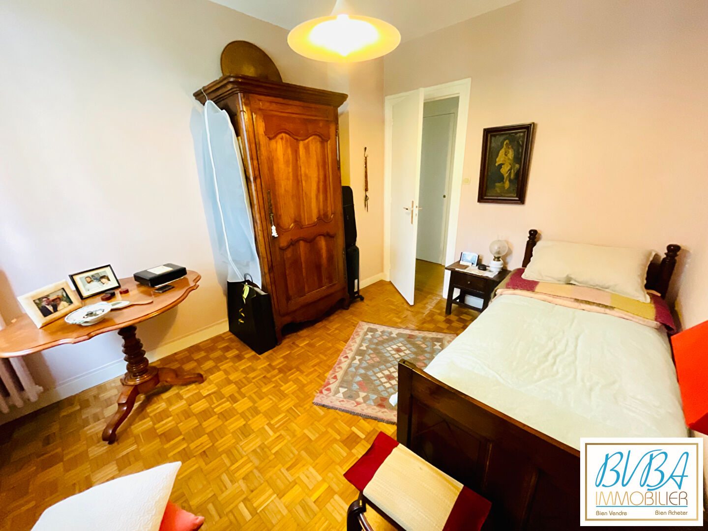 Côté nuit : deux belles chambres sur parquet massif, une salle de bain, un WC séparé et de nombreux rangements complètent ce bien.