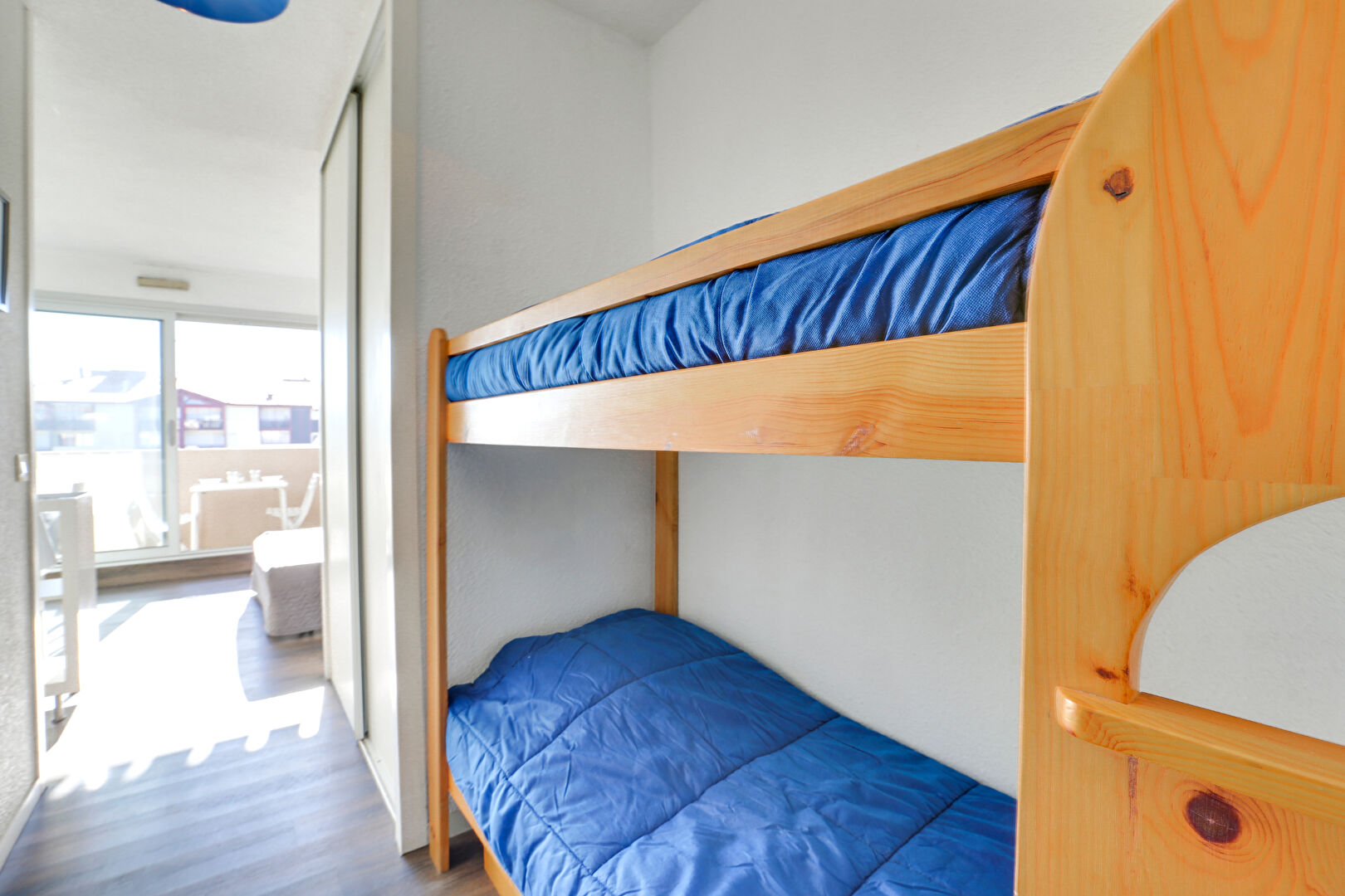 une entrée avec lits superposés, une salle de bain, un wc indépendant, une pièce de vie avec kitchenette, une chambre et une terrasse couverte.